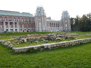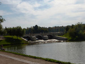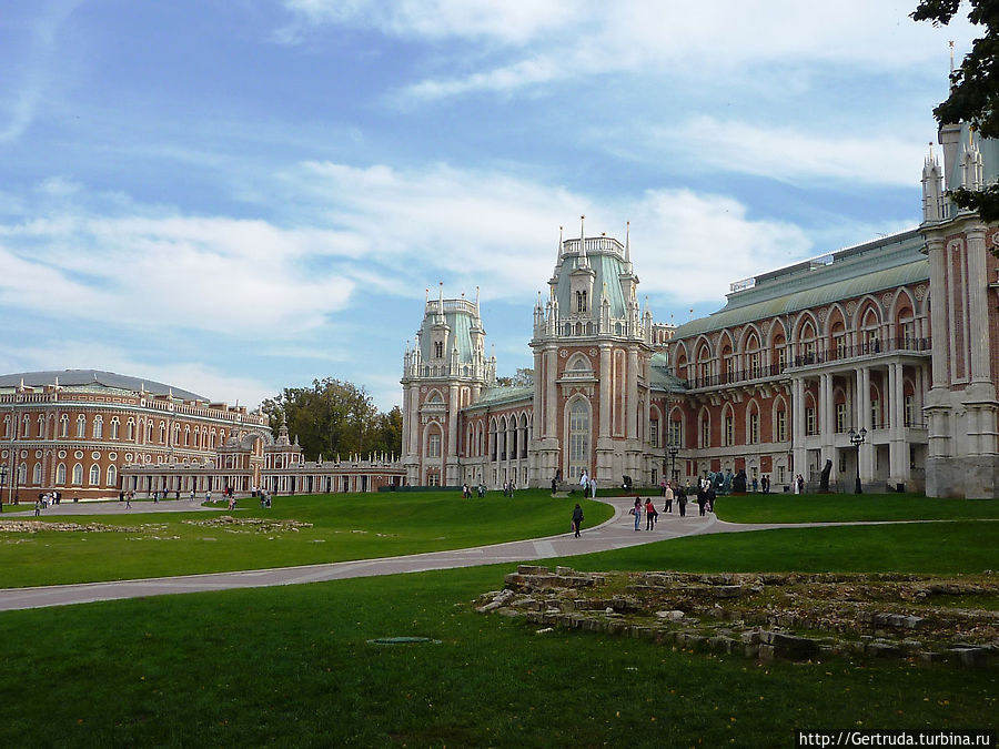 Пруды соединены мостами, есть даже плотина.Какая же там красота! Перед нами постепенно разворачивается живописный архитектурный дворцовый ансамбль, который первоначально строился архитектором Василием Баженовым для императрицы Екатерины Великой, но по неизвестным причинам не был принят ею, и разобран. Затем Екатерина поручила работы по возведению нового дворца архитектору Матвею Казакову. Десять лет трудился мастер, но Екатерина II так и не успела оценить его работу — она умерла в 1796 году, не дождавшись окончания строительства. Долгие годы Большой дворец стоял недостроенным, стал разрушаться, большую часть уничтожили, разобрали.