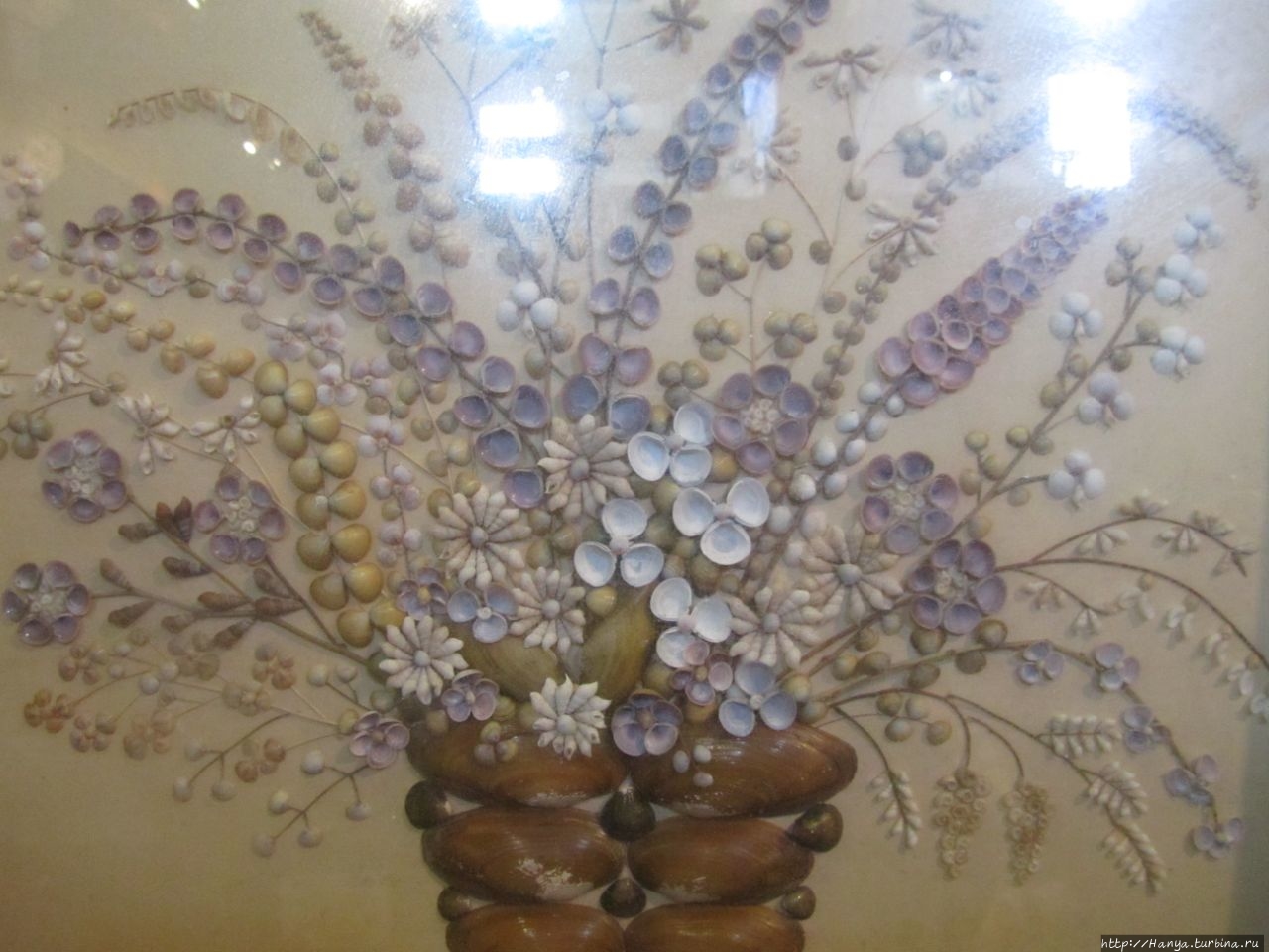 Завершают экспозицию изделия из ракушек – куколки, картины и даже тончайшая резьба по ракушке!