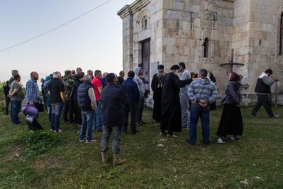 По традиции приводят к церкви барана. Нужно 3 раза обойти с жертвенным бараном вокруг храма, а потом выпустить его на волю. И кто его поймает, того и баран. Поэтому за человеком с бараном сразу же идёт несколько человек в ожидании и с надеждой поймать бедное животное)) Ну а потом из этого барашка готовят шашлык. В качестве жертвенного животного приносят и курицу.