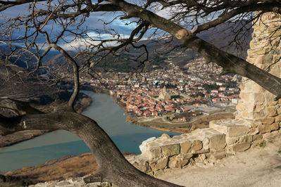 Мцхета — очень древний город, первая столица Грузии, и фактически сердце грузинской цивилизации. Хотя от прошлого здесь осталось всего несколько храмов, из которых только два — крупные. Это, во-первых, монастырь Джвари, что в переводе означает "крест", откуда открывается потрясающий вид на город, и, во-вторых, находящийся в самом городе Кафедральный собор Светицховели — храм, который является самым главным храмом Грузии и название которого означает «животворящий столп». Мцхета расположена в месте слияния двух горных рек – Арагви и Куры. И на фото можно видеть, что в месте слияния даже цвет воды у каждой из рек разный! Я посетила Мцхету зимой, и, надо сказать, ветра в этом месте очень сильные! Буквально сносит. Несмотря на чудесные виды, историю и значимость места, туристов здесь — а мы были в декабре — практически не было. Наша группа осматривала город чуть ли не в полном одиночестве. Надо приехать летом и сравнить!