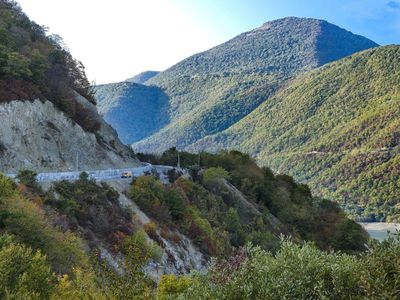 Современная трасса приподнята над водой, а внизу, вдоль берега водохранилища, до сих пор можно разглядеть остатки старинной Военно-Грузинской дороги — тот участок, которым пользовались еще со времен Российской империи.