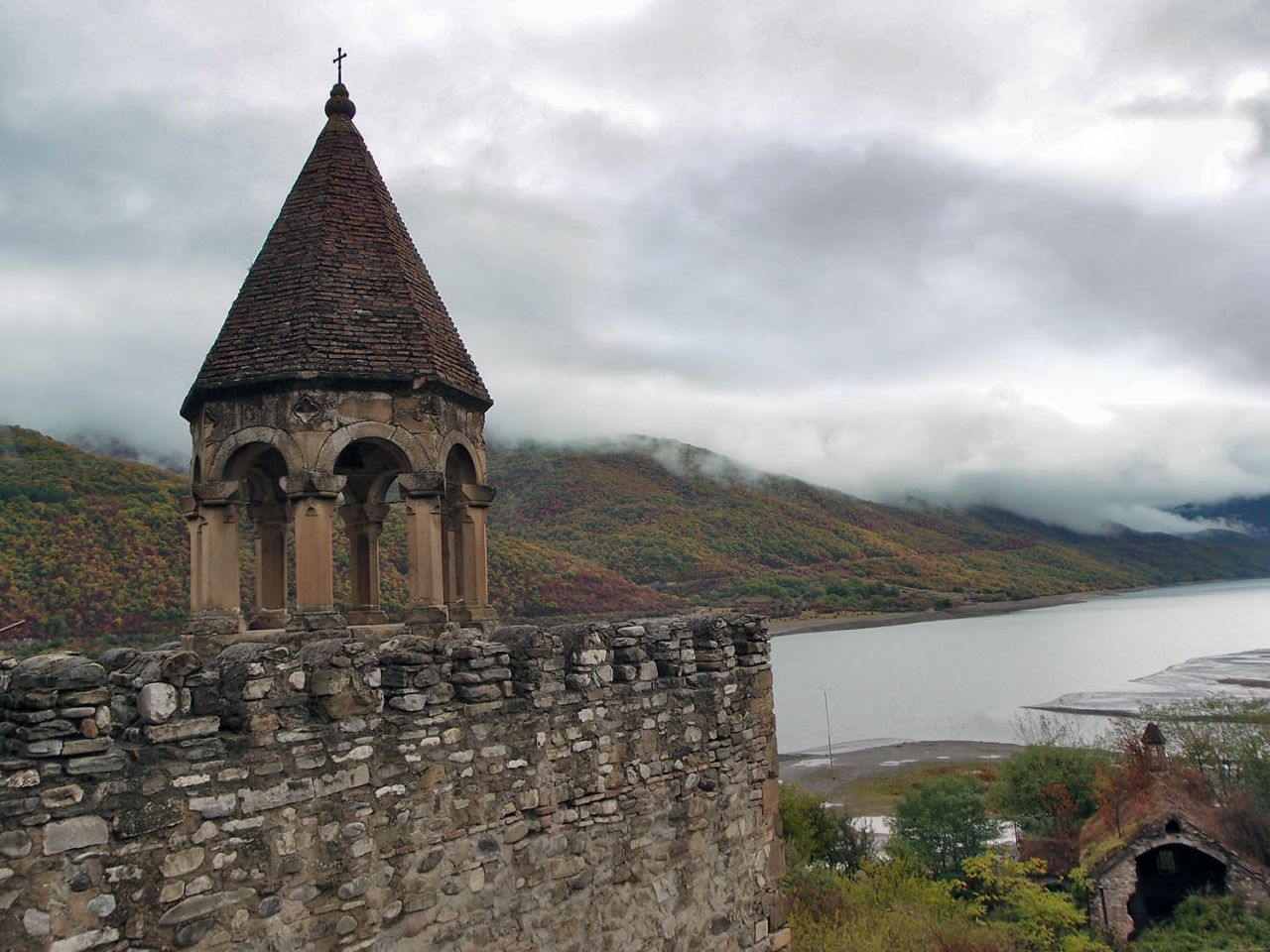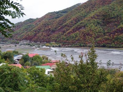 Регион Мцхета-Мтианети запомнился, как самый богатый на краски. Здесь осень была цветная, горы, сплошь покрытые лесами, достаточно пологие, а нашу прежнюю спутницу Мктвари (Куру) "сменила на посту" река Арагви — самая чистая и голубая из всех грузинских рек.