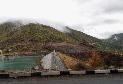 Вид а плотину с дорогиЧистейшая вода Арагви хлынула в долину и бирюзовым зеркалом застыла у подножия гор. От периодически меняющегося уровня воды на этих подножиях появились ровные контуры, словно кантики, прорисованные художником.