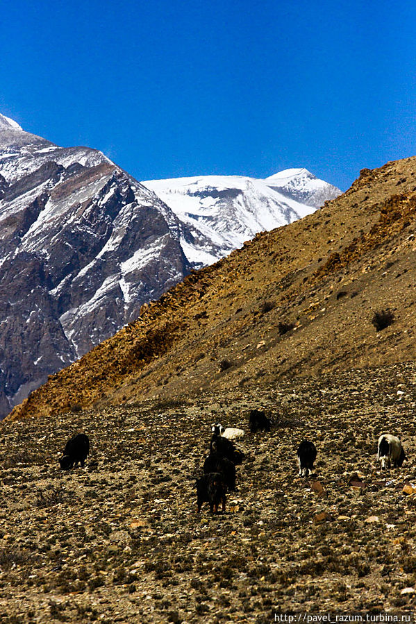 Преодолев очередной участок подъёма, мы встретили местного пастуха. Минутами ранее видели скот из молодых яков, пасущихся не склонах гор и щипающих редкую в этих краях травку. На самом деле было непонятно, что там, в земле, яки находят съестного. Окружающий марсианские пейзажи выглядели предельно пустынными. Попозже я еще напишу, откуда и с каким трудом местные доставали дрова.