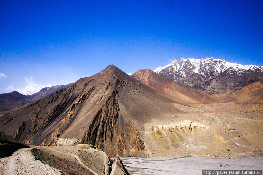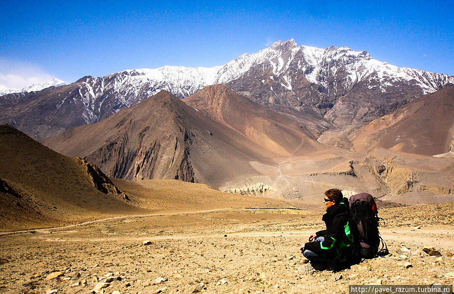 В какой-то момент подъёма мы увидели высокий холм, на вершину которого и взобрались, оставив рюкзаки снизу. Вид с него просто порвал мой мозг и остановил ум! На какой то момент я понял весь буддизм Я был за пределами ума, всех его концепций и двойственности. Потерялся даже Я сам. Были только горы – объект созерцания. Это была, пожалуй, самая прекрасная панорама на всём треке, да и в путешествии в целом! Я в самом сердце Гималаев. Отсюда открывался вид на восьмитысчник Дхаулагири (8172 м), верхушку семитысячника Нилгири (7061 м), на другие окружающие горы со снежными шапками. Далеко внизу простирались речные каньоны и ущелья. Так же перед нашим взором был перевал Тхоронг Ла, считающийся одним из самых высоких в мире. Его уровень — 5416 метров, что на 600 метров выше Монблана, самой высокой горы в Альпах, и всего на 200 метров ниже вершины Эльбруса. Перевал расположился заснеженным седлом между двумя соседними вершинами Йакваканг (6482 м) и Тхорунг-Пик (6144 м). Рядом так же блистала вечными снегами вершина Кхатунгханг (6484 м). С другой стороны нашей панорамы мы могли наблюдать воистину марсианские пейзажи из оранжево-красных гор, а так же вдали длинную горную гряду со снежниками, закрывавшую Верхний Мустанг. Крыша моя на время отъехала!