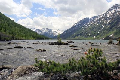 Куйгук озеро холодное и в июне здесь местами ещё стоит лёд, а горы ещё до конца не освободились от снежного покрова.