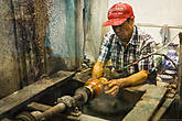 Прижимая лист к чугунной болванке, легкими ударами молоточка мастер придает изделию первоначальную форму. После чего изделие проходит начальную шлифовку, чтобы убрать все заусенцы и неровности.
