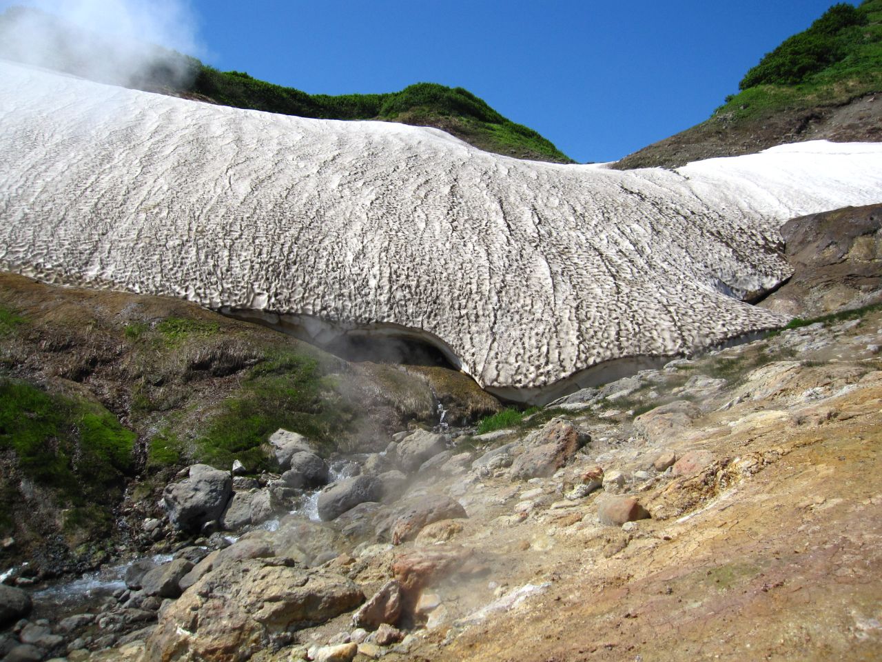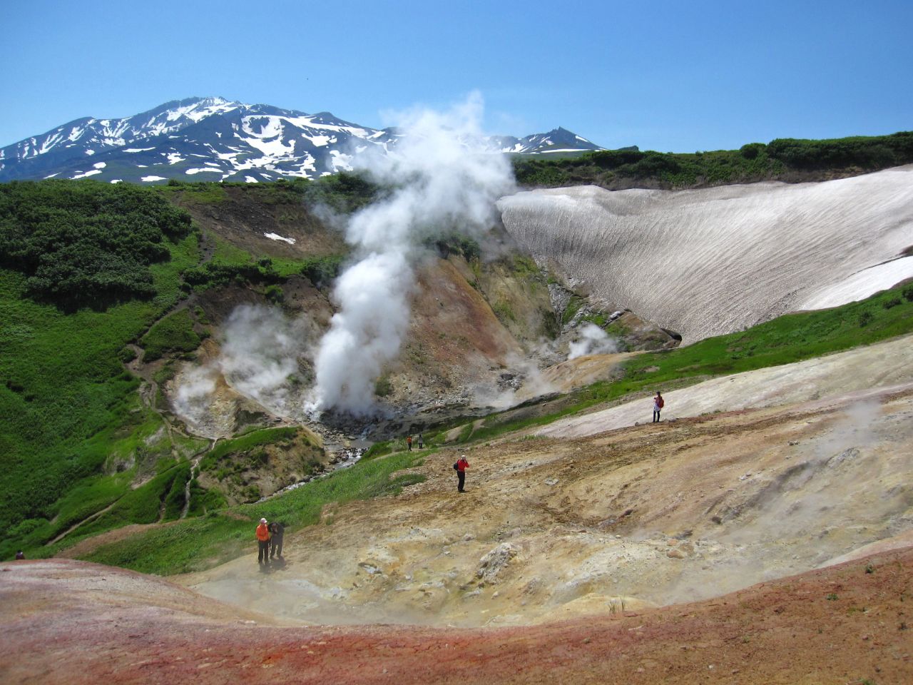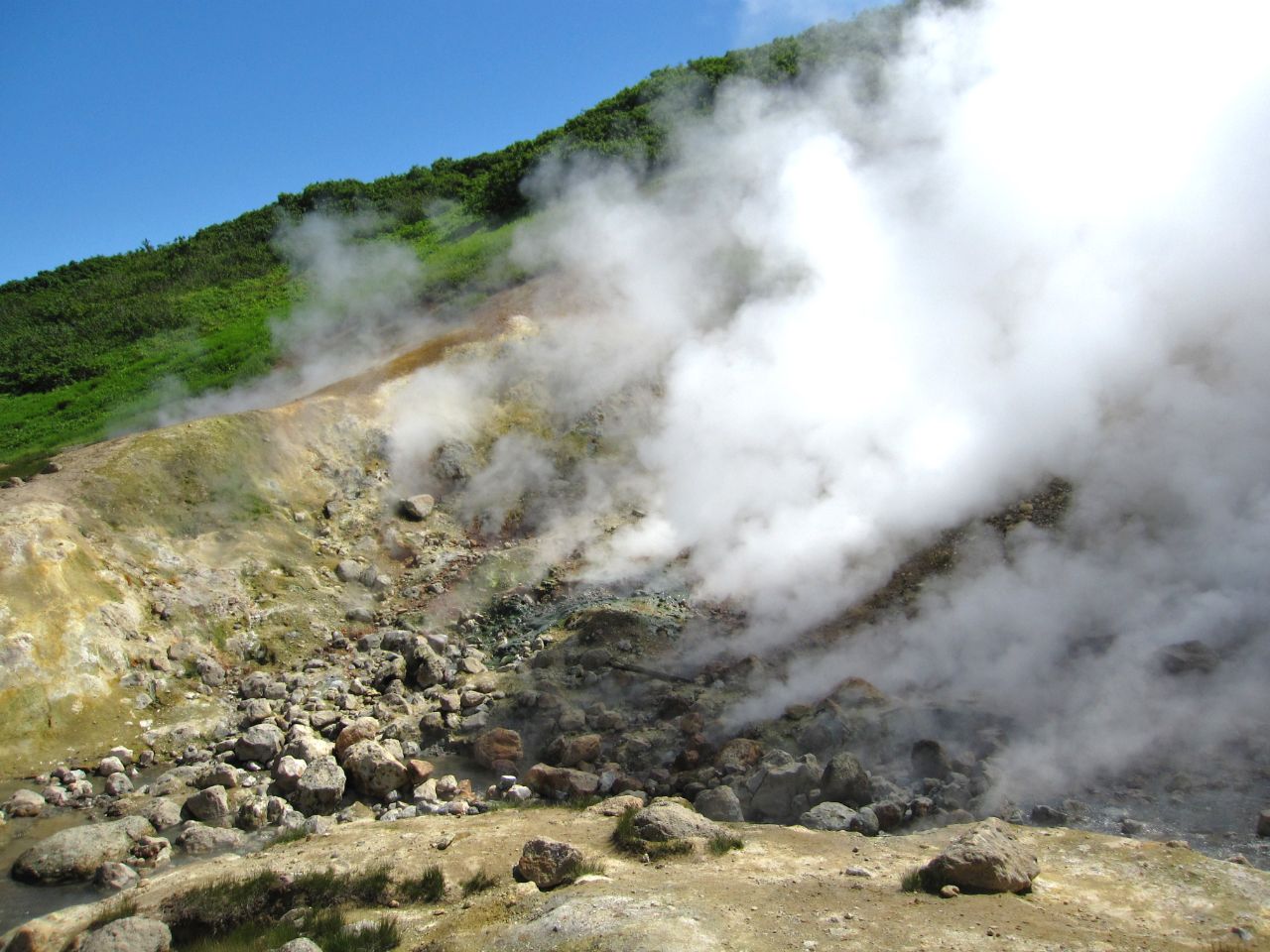 Дачные источники намного меньше по территории и выглядят менее живописно, чем Долина Гейзеров, но здесь, в отличие от Долины Гейзеров, где ходить разрешается только по специальным тропинкам и мосточкам, можно свободно передвигаться и ходить где хочется, и всё кипящее хозяйство можно посмотреть и сфотографировать вблизи и практически рядом.