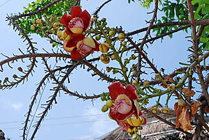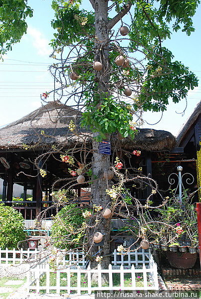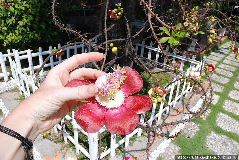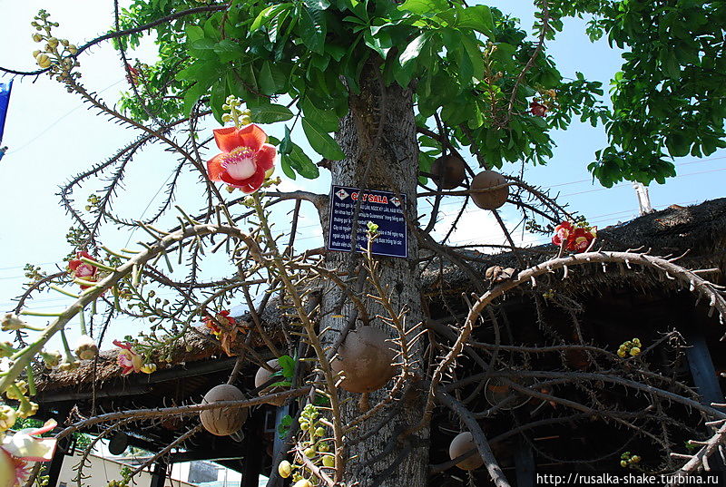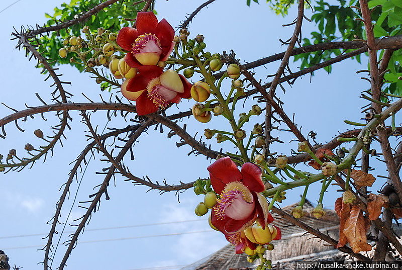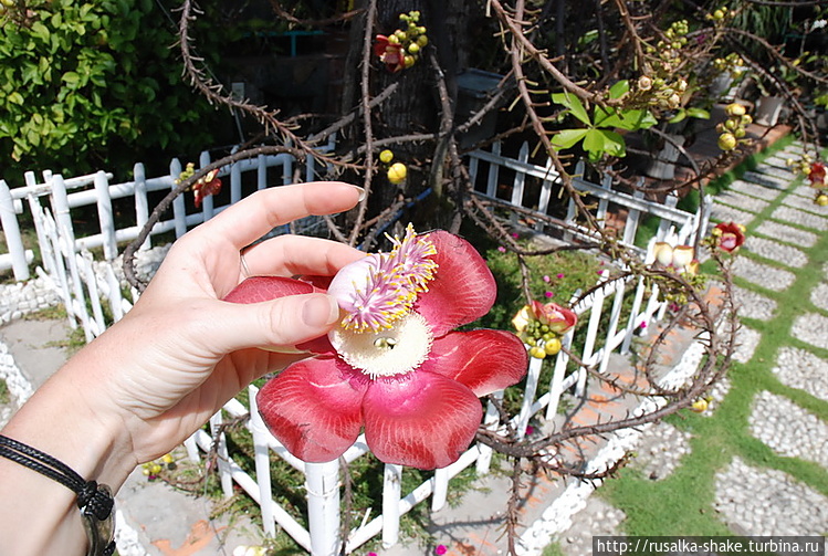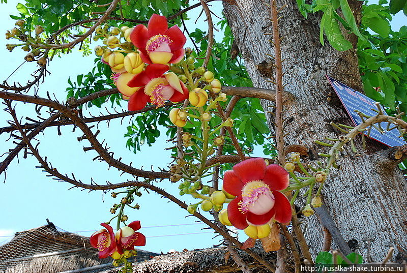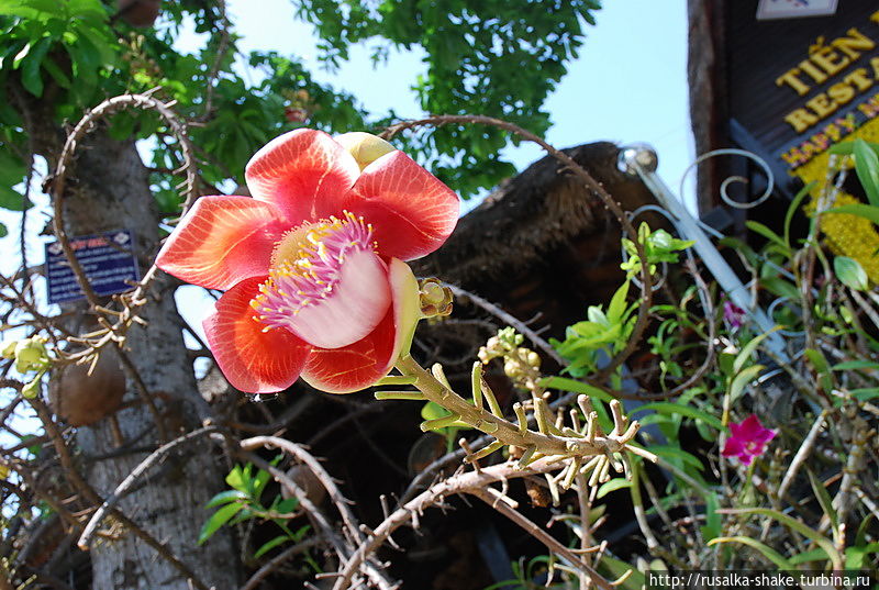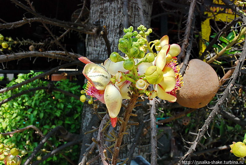 Возле одного из заведений я увидела такое дерево. С колючими ветками, но с необычными цветами. Полюбуйтесь!