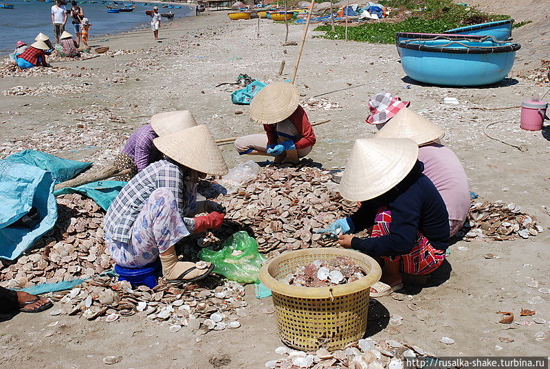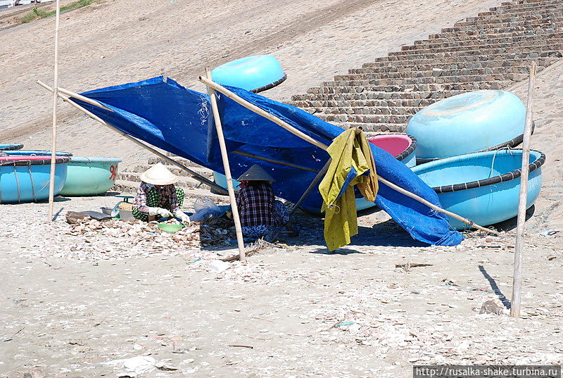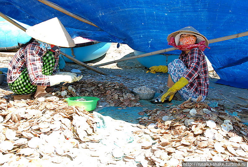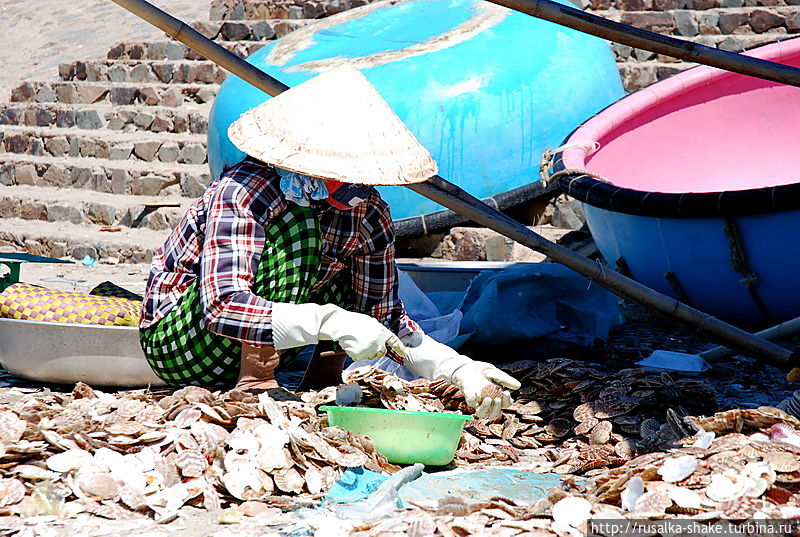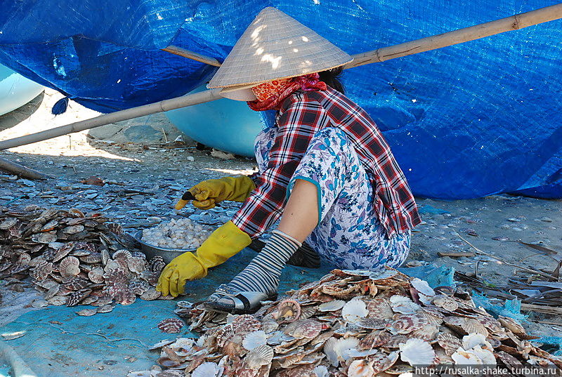 Сюда я приехала утром, надеясь встретить рыбаков с ночной рыбалки. Наивная... Для меня 10 часов — это утро, а для рыбаков это почти день). Так что я застала женщин, во всю работающих по сортировке "даров моря". Некоторые тут же перебирали ракушки и даже очищали их, специальным инструментом отделяя мясо морского гребешка от раковины.