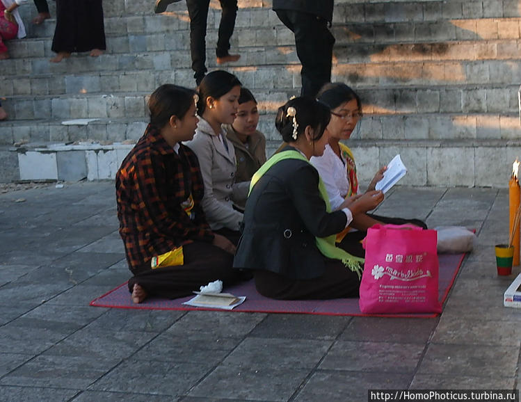 Пагода, конечно, сказка, центральная колоссальная слепящая на солнце глаза доминанта возвышается по центру холма, окружена ступами поменьше, в свою очередь все это замыкается храмами причудливой резьбы. Много иностранцев, особенно хиппи, но и аборигенов тоже хватает. Последние лучи солнца пагода как бы подхватывает и вспыхивает, сверкает на огне, а спустя четверть часа включается искусственная подсветка, и это — одно из самых потрясающи зрелищ в жизни. Правда, есть и забавное: многие статуи Будды с заходом солнце приобретают фон, переливающийся нимбами всех цветов:)))