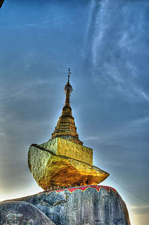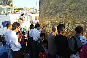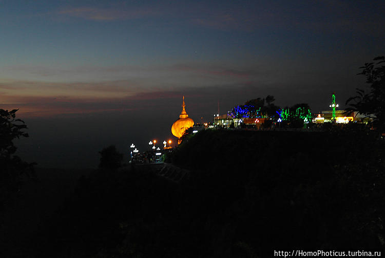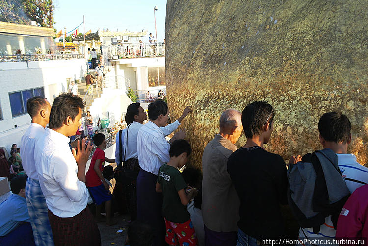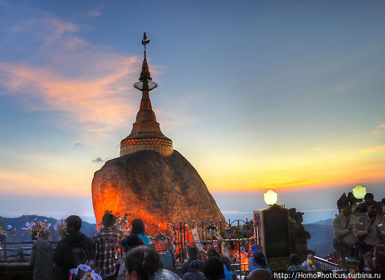 Дорога к храму выложена мрамором и гранитом ,солнце готовилось заходить еще через час, народ готовил ужин, молился, приветствовал друг друга и фотографировался, и первые сооружения, говорящие о том, что это место не простое, появились спустя метров двести от отеля. По дороге обнаружил за одним зданием нечто, напоминающее ступу на камне, но , к счастью, оказавшееся новоделом и просто имитацией . Настоящая красота показалась чуть позже — красивейший огромный валун, лежащий на краю отвесной скалы, частично нависающий над бездной — полностью золотой и блестит в лучах предзакатного солнца чуть ли не ярче самого светила, а на нем стоит небольшая ступа такого же золотого цвета и создается впечатление, что она — одно целое с валуном, который от падения в пропасть предохраняет лишь волос Будды, заложенный в основание пяти-с-половиной-метровой ступы. Заложил ступу на камне правитель Тисса, получив волос от отшельника, который пообещал, что волос будет храниться вечно, если найдется камушек, по форме напоминающий его голову. Царь-провидец такой валун нашел (да, голова, конечно, не идеального хомо сапиенса),ну и пока держится уж две с половиной тысячи лет , даже руссо туристов его пока не столкнули. Камушек и ступа золотые действительно от золота, которым его покрывают паломники с помощью бумажек, на которые это самое сусальное золото и нанесено. Женщин к камню не пускают — молятся в считанных метрах от валуна. Мне вот к ноге как раз золотой лепесток после подхода к камню (босиком, естественно ) прилип (не пинал я камень, честно) — тереть долго ногу мыть не буду :)Территория обустроена замечательно, камень виден со всех сторон, можно его обойти как угодно — разве что верхом на него залезть нельзя, Паломников очень много, даже больше, чем в новогоднюю ночь туристов. во время шикарного заката камень приобретает красивый красноватый оттенок, а чуть позже включается подсветка — в общем, голден рок всегда голден :)