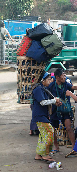 Спустя еще полчаса езды, добрались до перевалочного пункта, на котором обрадовали тем, что в начале десяток километров надо ехать на мощном грузовике по весьма крутому серпантину, а потом ставят перед выбором: или нанимаешь местного шерпу-носильщика за эквивалент полутора десятков долларов, или тащишь километра три по еще более крутому серпантину на собственном горбу. Тут отдельный народ взбунтовался, ибо трансферы в стоимость тура были включены, а тут все же непорядок, непредвиденные расходы, да и принцип, плюс к тому, не все сложили багаж так, чтобы чемоданы можно было в жестком режиме транспортировать. Ну, большинство покапризничало и сдалось, отдельные вредные личности, включая меня, потащили на себе :)