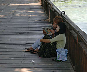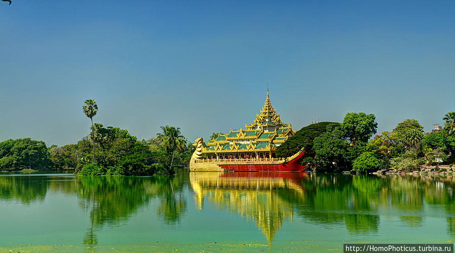 Следующая точка — озеро-болото Кандоджи чуть ли не в центре города. Воняет страшно, не чистили его, видимо. века:))) Вдоль одного из берегов сделана довольно длинная дорожка в виде изогнутого лабиринтами тикового моста , по которой гуляет множество местных, а на обочинах сидят и обнимаются парочки:)) но если пробежать местечко, к которому прибивает всю цветущую и тухнущую гадость, можно получить колоссальное удовольствие от уже благородного насыщенного зеленого цвета воды, в которой отражаются выстроенные на берегах маленькие храмики и ступки, а посредине стоит на приколе баржа правителя Каравейк , восстановленная по античным чертежам. И если забраться по этой дороге далеко, открывается красивый вид на Шведагон — та самая доминанта города, которая является символом Янгона, да и всей страны:)