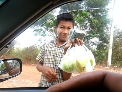 везут, делают из них и ореха пальмы бетеля зеленые прямоугольнички и свободно продают на каждом углу.Этот мальчик продает не только фрукты, но и бетель. ( в коробочках)
