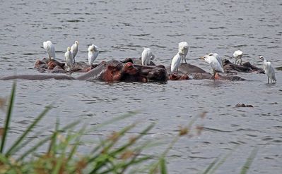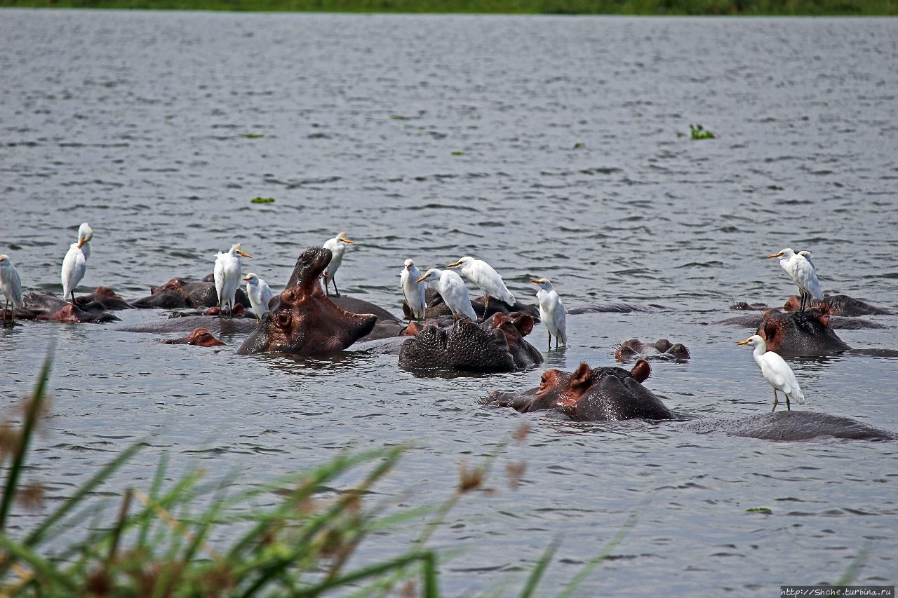 А те коричневые кочки справа, на которых сидят эти птицы — это не камни, торчащие их воды. Это... да-да... стадо отдыхающих бегемотов!