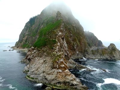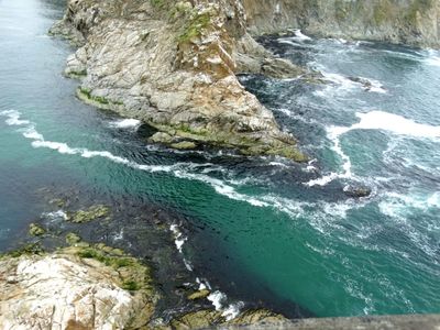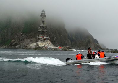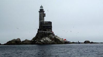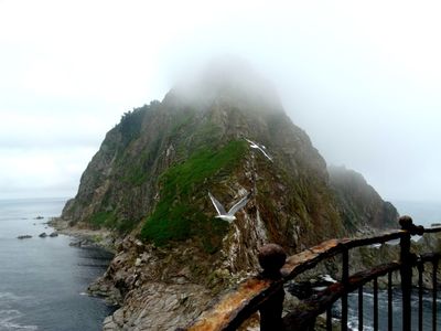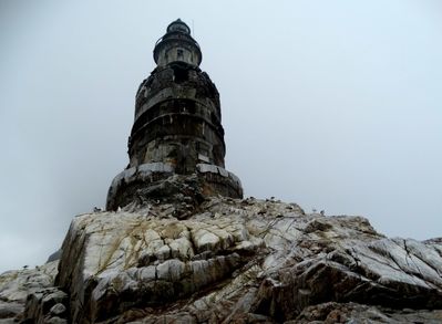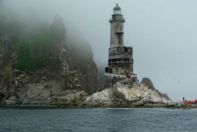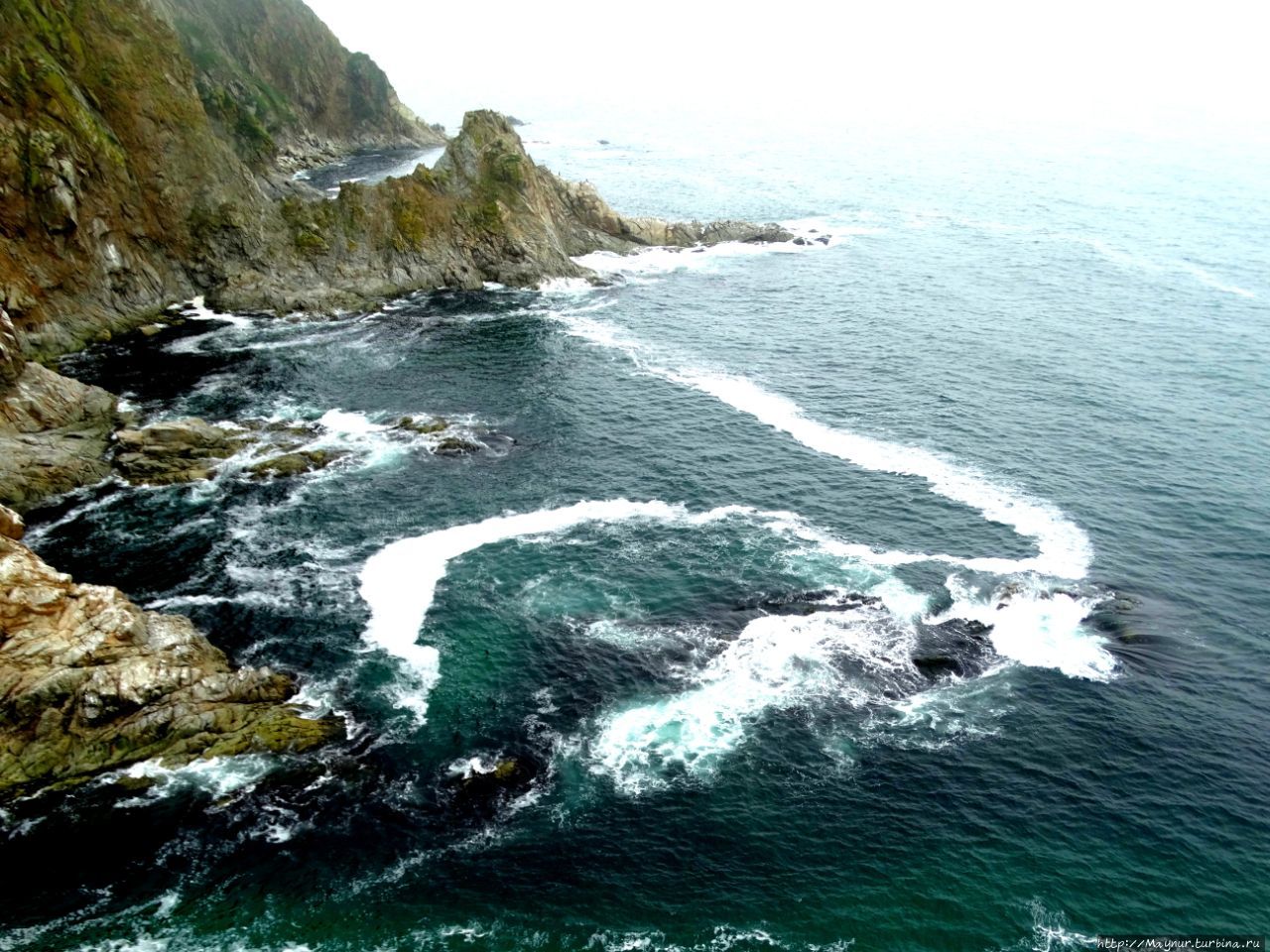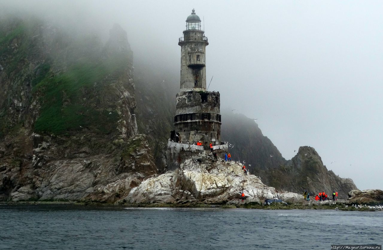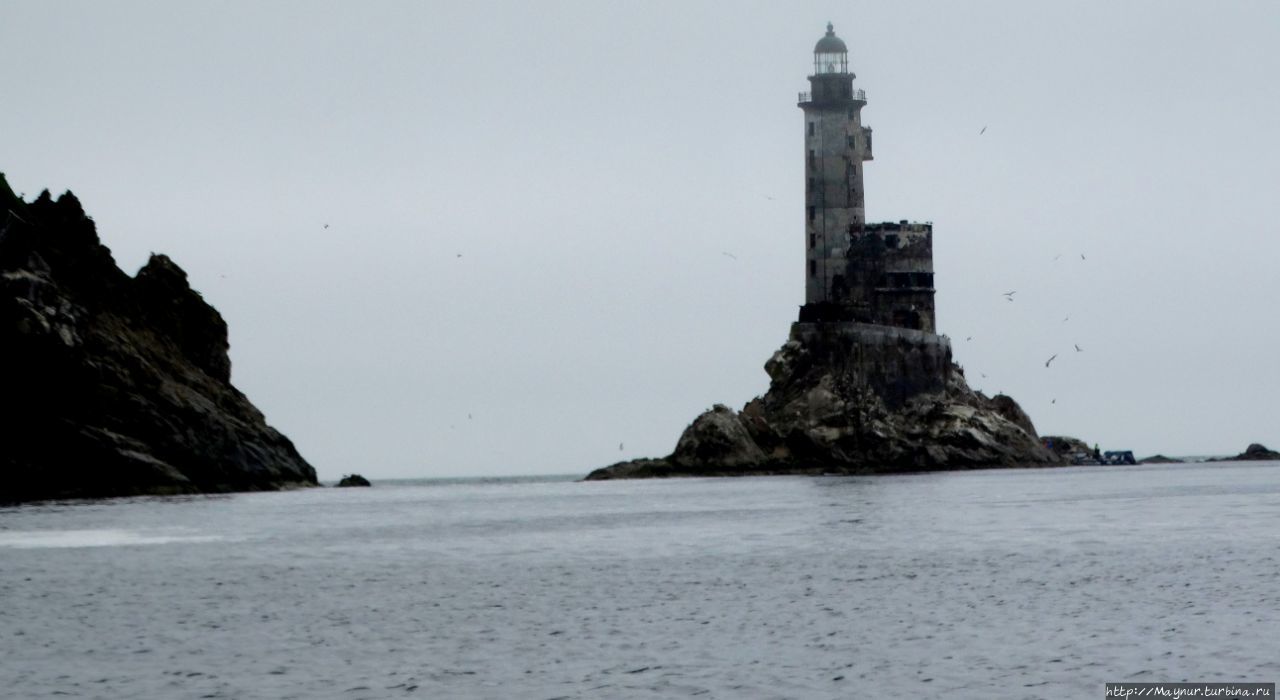 пробивающего толщу тумана и темноты на расстояние в 35 км. и установленного на самой макушке маяке. На девятом этаже.Помимо того, что маяк построен на скале, имея цокольный этаж в самой скале, он находится на месте, где проходит незримая граница вод Анивского залива и Охотского моря. Пересекая эту границу на лодке, сразу попадаешь в другую стихию, в которой и ветер крепче и волны круче. Даже жутковато в резиновой лодочке находиться.
