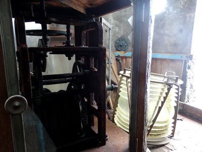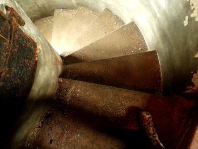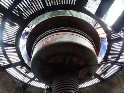 Эта труба проходит через весь маяк. Внутри трубы был подвешен маятник — гиря весом 270 кг., заводимые каждые три часа для движения оптической системы.