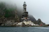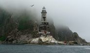 пробивающего толщу тумана и темноты на расстояние в 35 км. и установленного на самой макушке маяке. На девятом этаже.Помимо того, что маяк построен на скале, имея цокольный этаж в самой скале, он находится на месте, где проходит незримая граница вод Анивского залива и Охотского моря. Пересекая эту границу на лодке, сразу попадаешь в другую стихию, в которой и ветер крепче и волны круче. Даже жутковато в резиновой лодочке находиться.