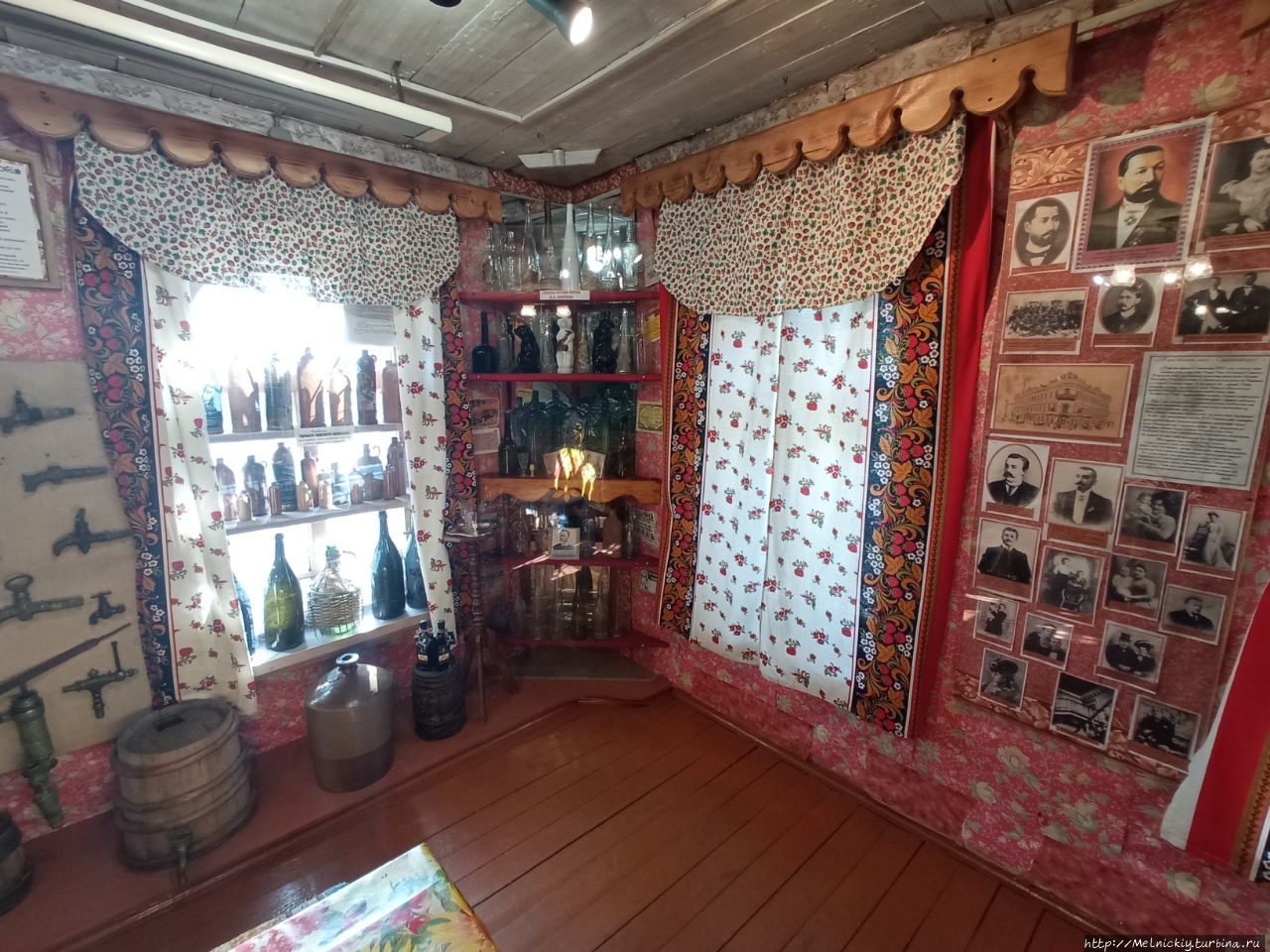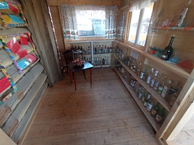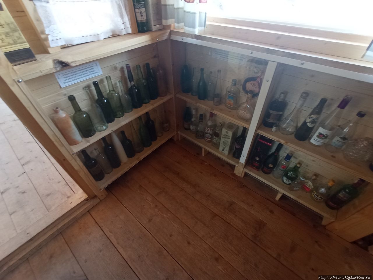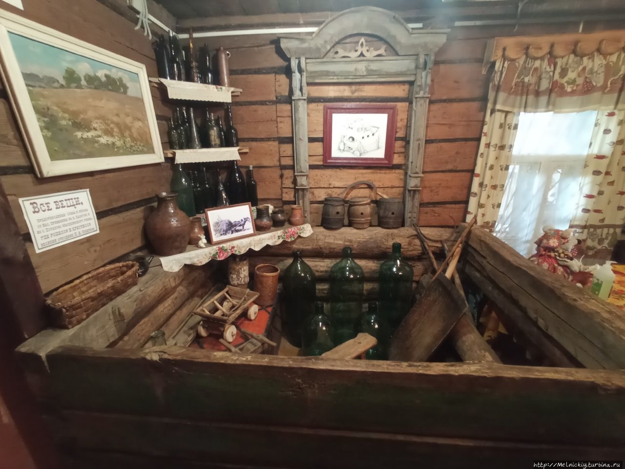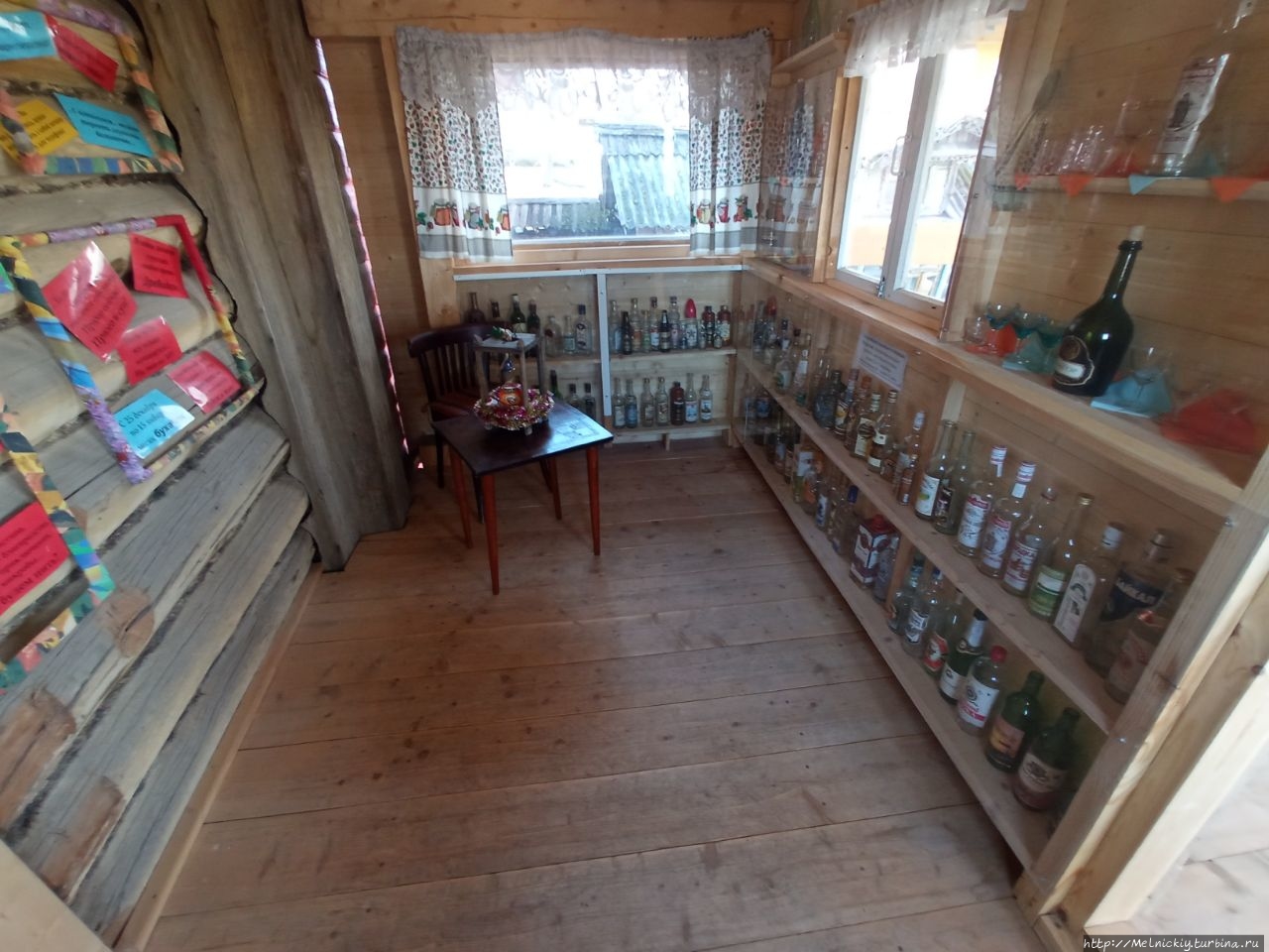 В сенях выставлены образцы разных бутылок, а на стенах вывешены смешные изречения, посвященных пьянству.