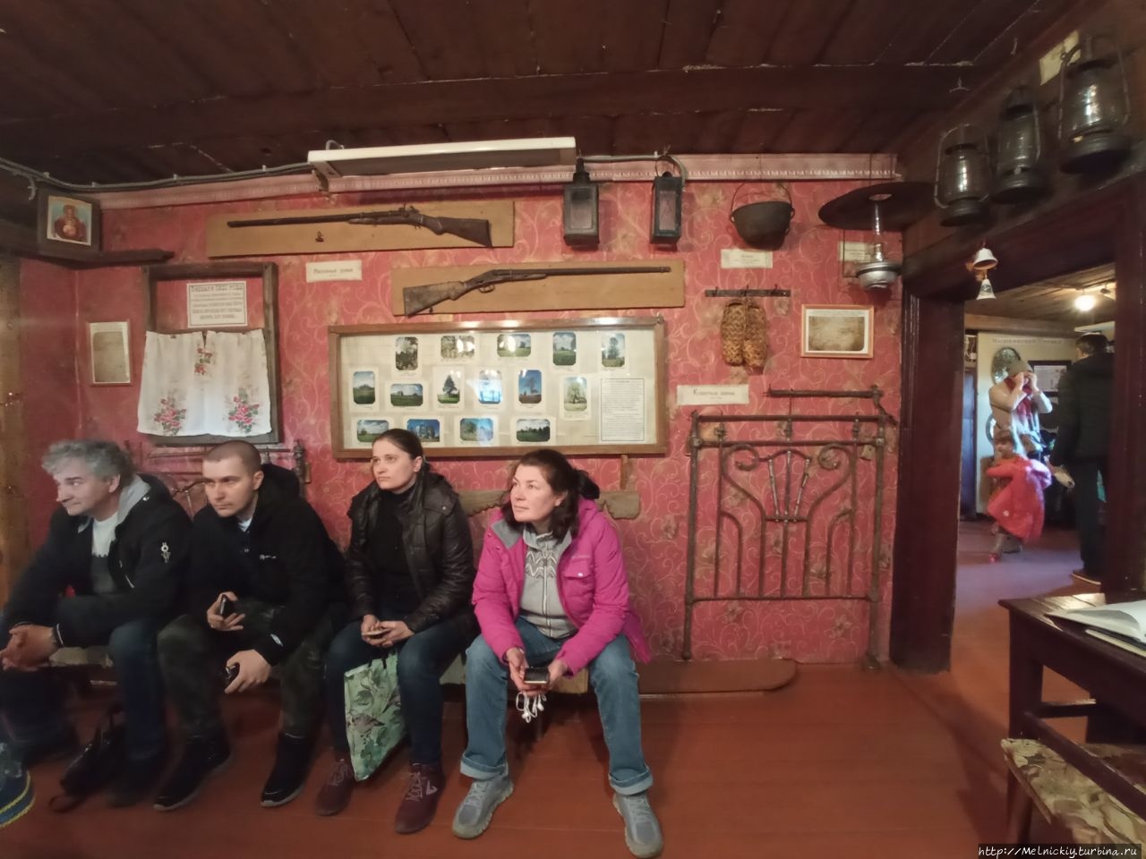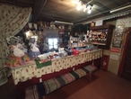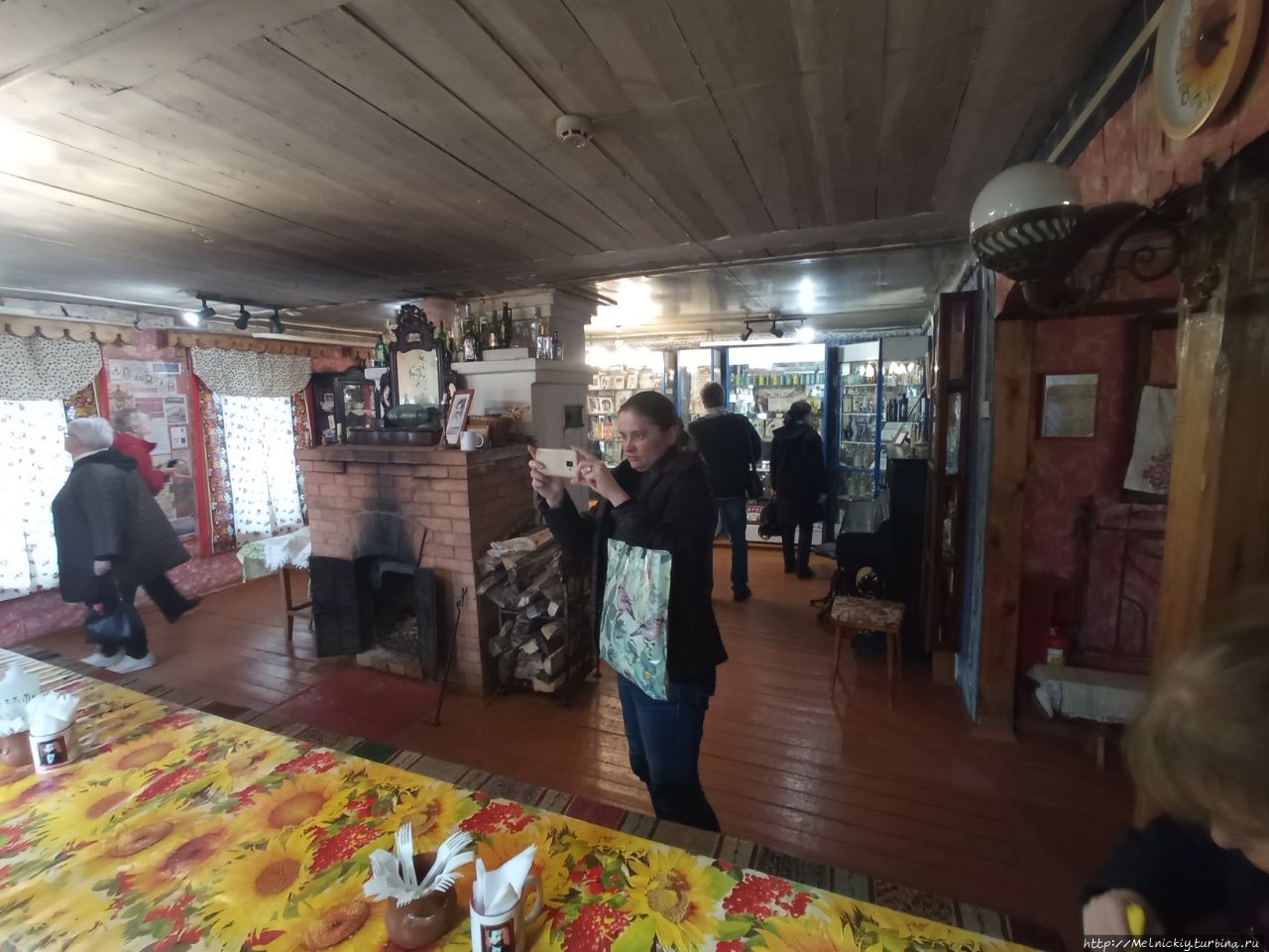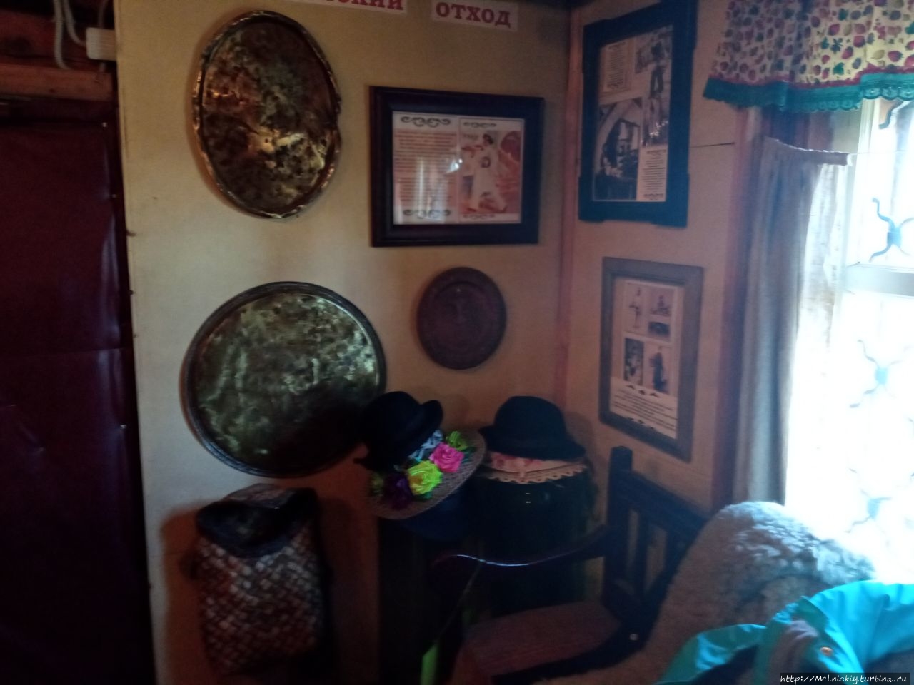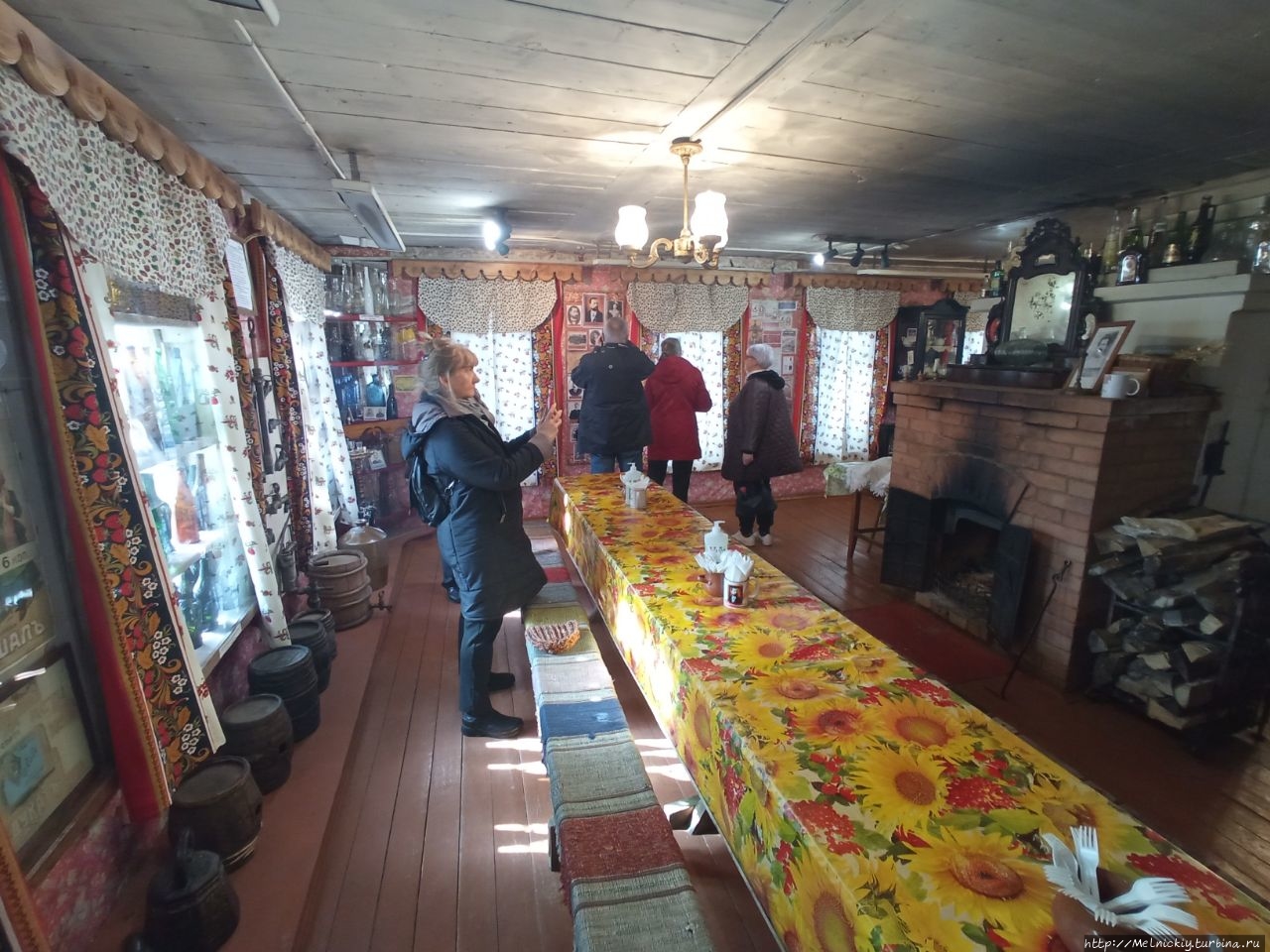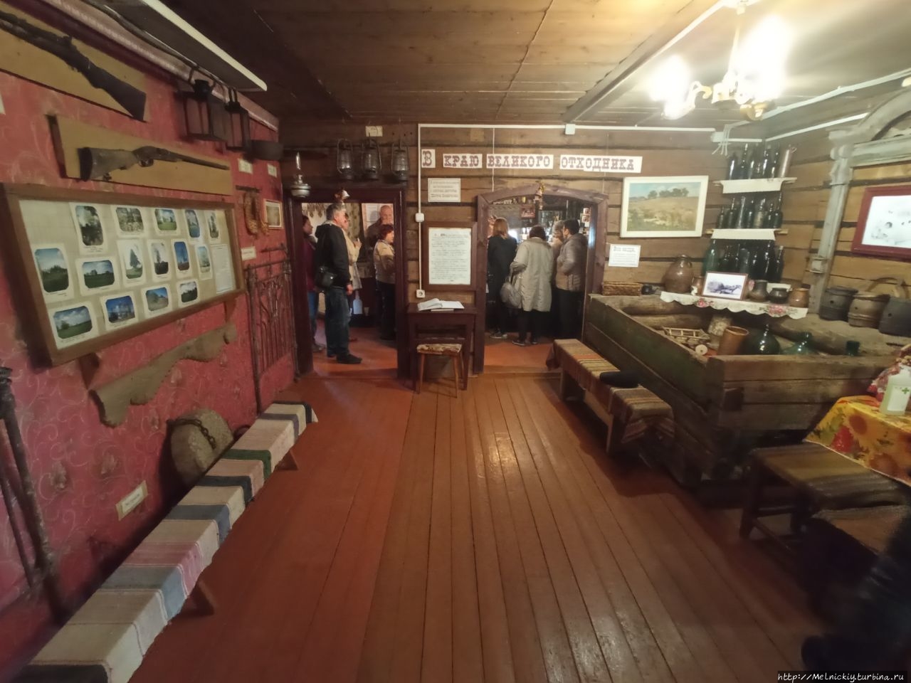 В сенях выставлены образцы разных бутылок, а на стенах вывешены смешные изречения, посвященных пьянству.