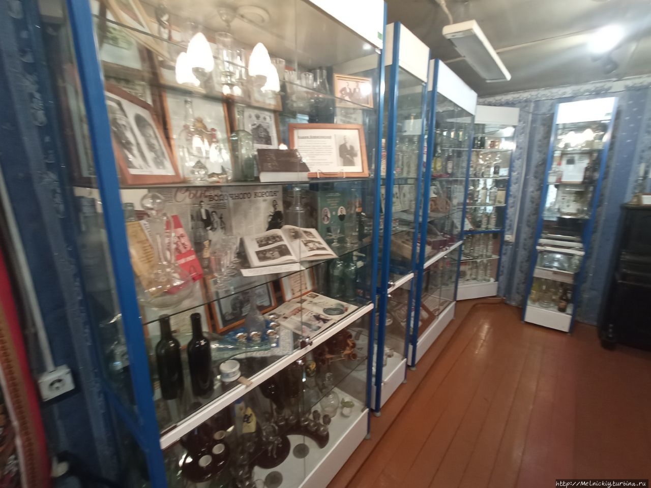 А в большом зале выставлены образцы старинных бутылок и штофов, одни из первых винных этикеток, стаканы, рюмки и подносы. Отдельно представлены личные вещи Петра Смирнова.