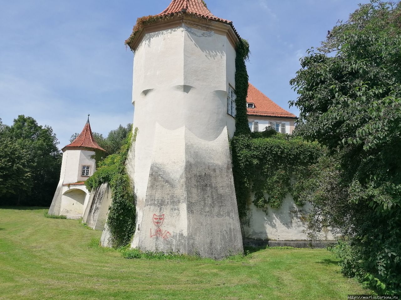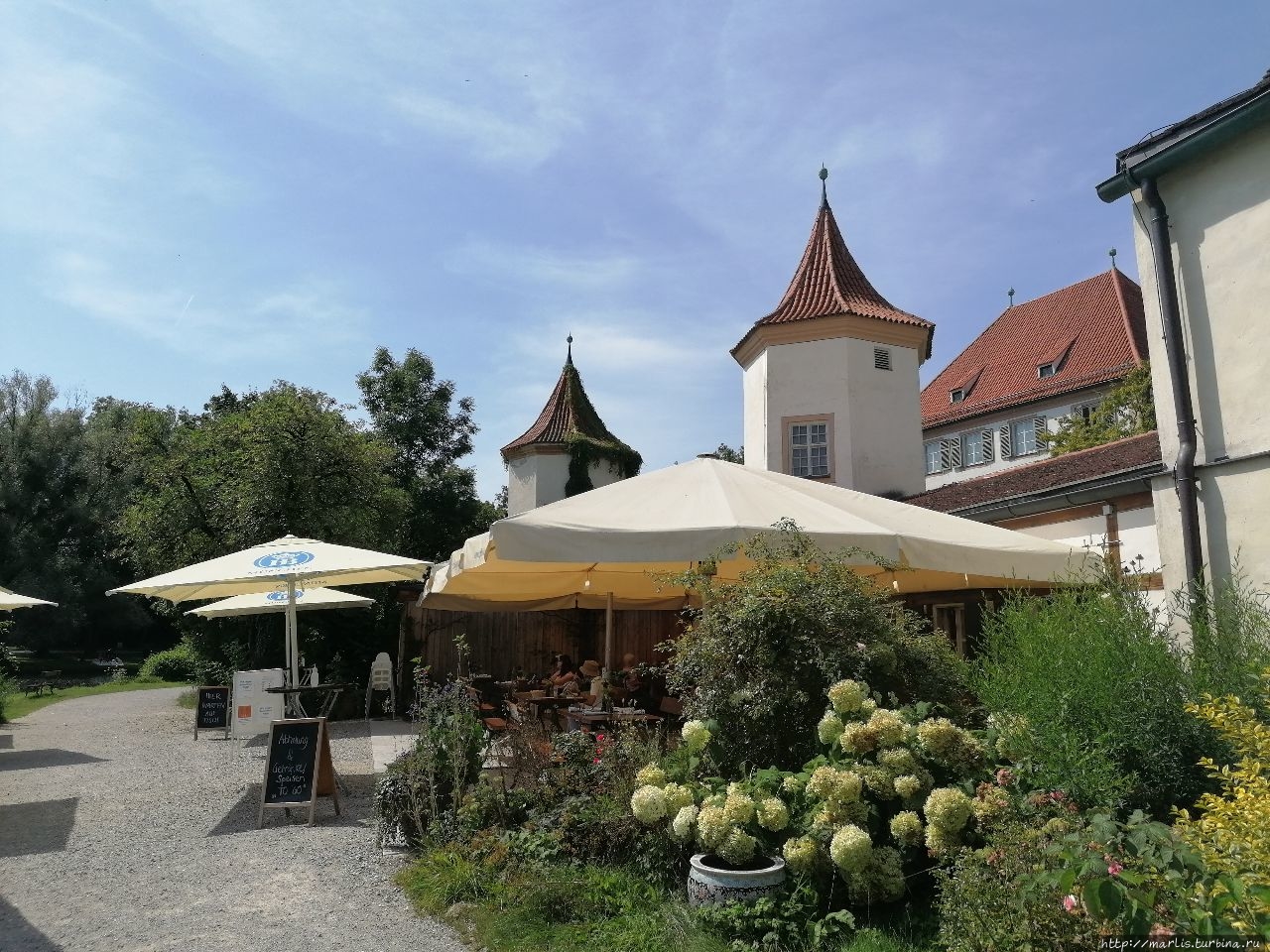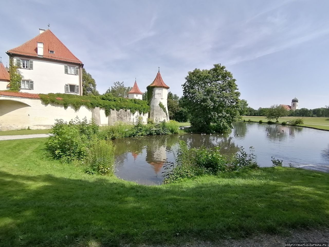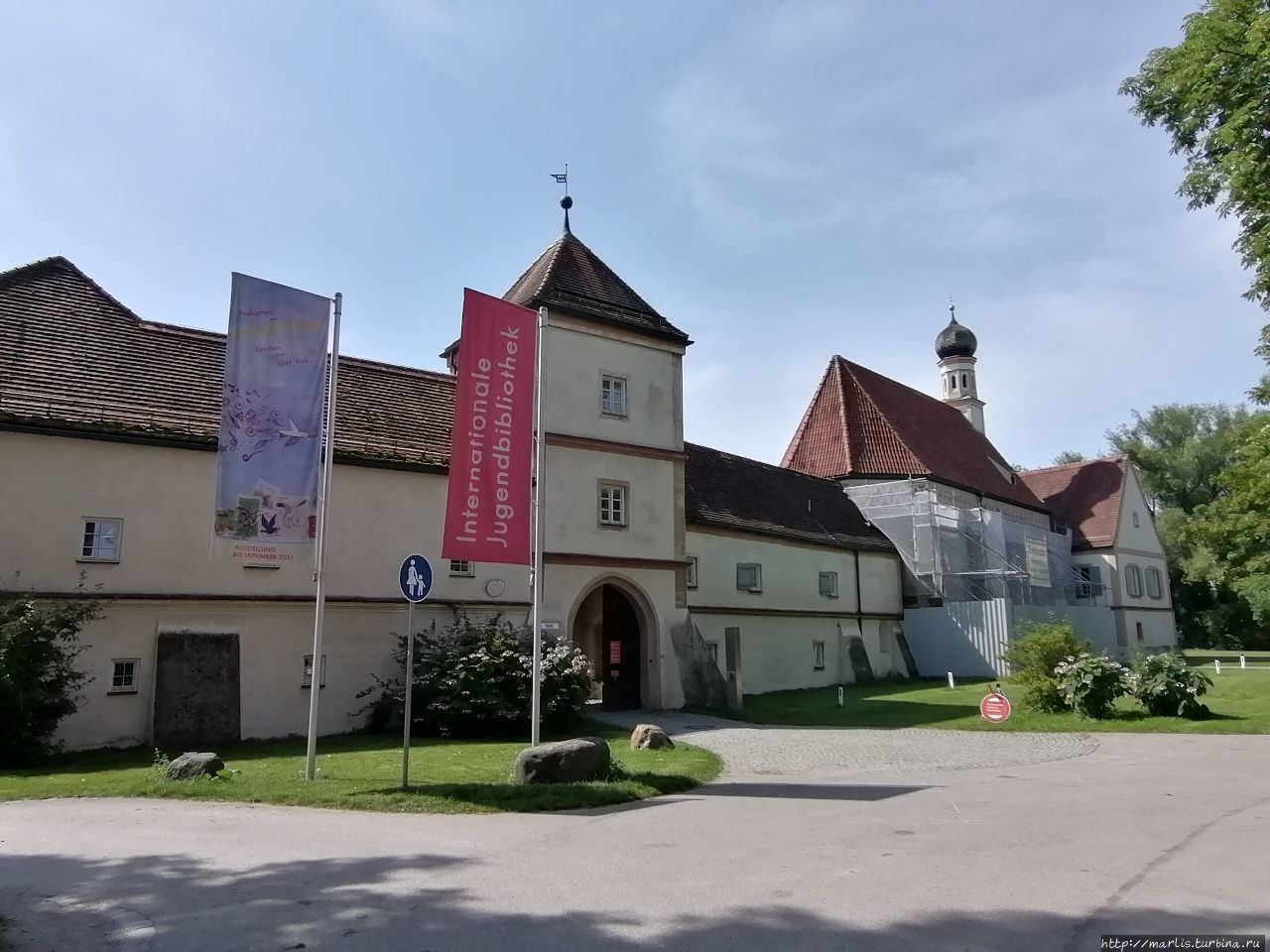 Согласитесь, замок Блютенбург очень живописен. Расположен он в парке и со всех сторон окружен водой. С одной стороны протекает речушка, с другой — искусственные пруды. На территории этого бывшего охотничьего замка сейчас размещается Детско-юношеская библиотека Мюнхена, есть еще действующая церковь и ресторан.