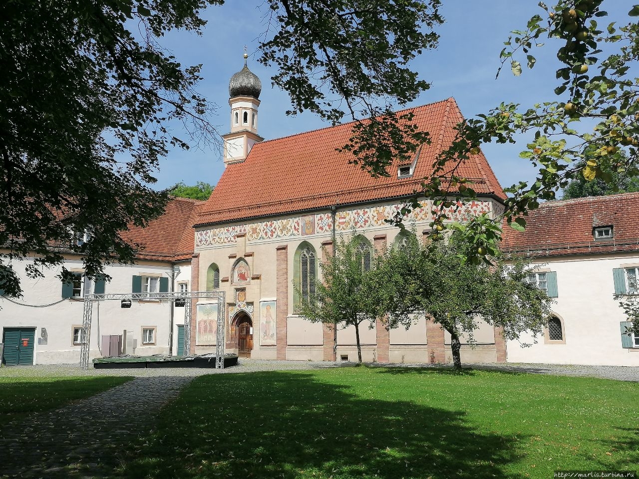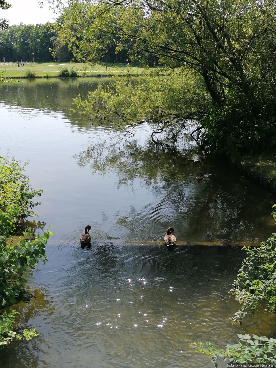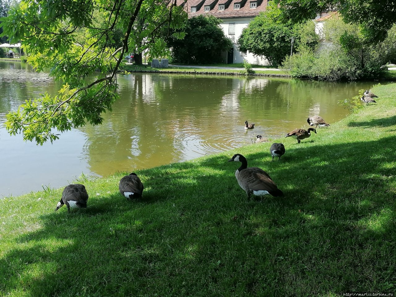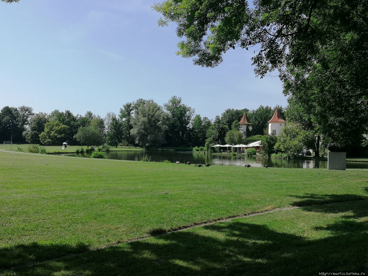 Согласитесь, замок Блютенбург очень живописен. Расположен он в парке и со всех сторон окружен водой. С одной стороны протекает речушка, с другой — искусственные пруды. На территории этого бывшего охотничьего замка сейчас размещается Детско-юношеская библиотека Мюнхена, есть еще действующая церковь и ресторан.