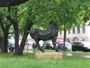 Городская галерея Ленбаххаус расположена в двух шагах от станции U-Bahn Кенигплац — неподалеку от Пинакотек, Глиптотеки, в самом центре сосредоточения художественных музеев Мюнхена. Но с 2009 по 2013 годы туда было не попасть — музей был закрыт на капитальную реконструкции по проекту мастерской Нормана Фостера. Я был в музее еще до реконструкции — и этим летом собираюсь сравнить впечатления. Тогда, полюбовавшись самой виллой, недолго — на улице шел дождь, мы купили билеты и пошли смотреть экспозицию. Состоит она из четырех неравноценных (на мой взгляд) разделов. Первый — мемориальная часть виллы, посвященная самому Ленбаху. Прославленный в свое время портретист и пейзажист, сегодня он интересен в основном героями своих картин, поскольку Ленбаху позировали знаменитости — Бисмарк, Моммзен, кайзер Вильгельм, император Франц-Иосиф, папа Лев XIII — за счет подобных заказов Ленбах разбогател и мог позволить себе виллу размером с небольшой дворец. Интерьеры художника с коллекцией немецких живописцев сохранили в память о даре вдовы художника, передавшей дом с обстановкой и картины в дар Мюнхену в 1924 году. Сюда же городские власти поместили и, до того разрозненную, коллекцию академической живописи. Я не самый большой любитель немецкой школы XIX-го века — но это лишь мои пристрастия, так что просто обойдусь без оценки. Это — вторая часть экспозиции.