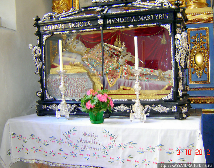За стеклом ларца на бархате возлежит истлевшее тело, скелет святой мученицы Saint Munditia. Ее мощи были перевезены в Мюнхен из Рима в 1675 году из катакомб.