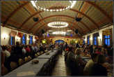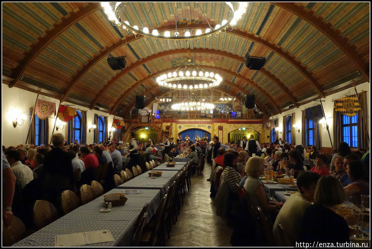 Как и в остальных залах, здесь музыканты в традиционных баварских костюмах играют залихватские полечки, но атмосфера тут более сдержанная. Кроме туристов, много местных, которые приходят поужинать семьями и даже с совсем маленькими детьми.