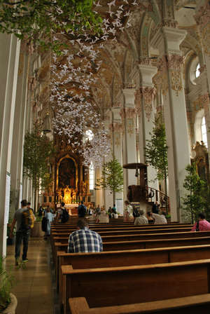 Потом вернулась в центр старого Мюнхена, прогулялась по Виртуалиенмаркт, народ обедал, пожирая мюнхенские специалитеты, запивая их пивом. И сама соблазнилась на пару сосисок, было вкусно. Зашла в любимую азамовскую Церковь Святого Духа, была поражена — ее украсили "деревьями жизни", бумажными журавликами. Народ сидел на скамьях, релаксировал-медитировал. Теплая атмосфера!