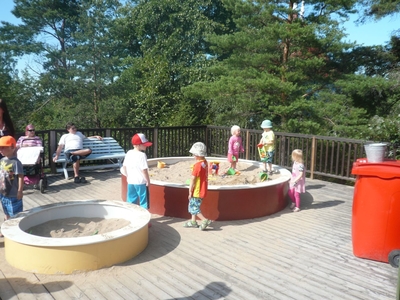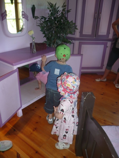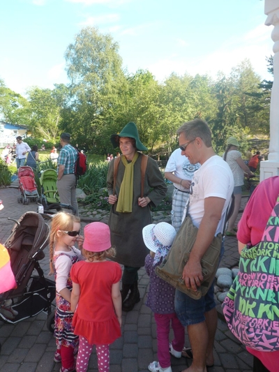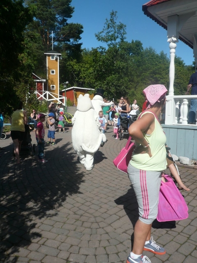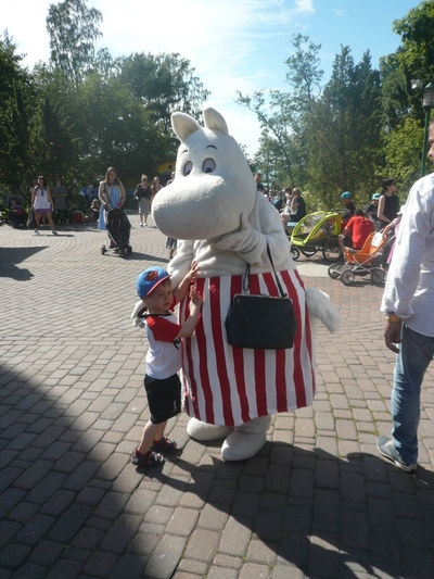 Знакомство началось с поездки на паровозике, а затем нам показали дом Муми-троллей: высокий и круглый, c голубыми стенами и ярко красной крышей. Перед домом нас встречали: Муми-тролли (Муми-папа и Муми-мама), Гуляя по долине, мы повстречали друзей Муми-троля: Снусмумрика, (Муми-тролль обожает слушать его истории и старается подражать ему), Снорочку — подругу в играх, малышку Мю (любит дразнить Муми-тролля, малышка Мю такая крохотная, что может спрятаться где угодно, например, в кармане у Снусмумрика. А еще она любит тайком за кем-нибудь следить — из нее вышлма бы превосходная шпионка)..Дружит Муми-тролль и с братом Снорочки по имени Снорк, и со Сниффом (.из-за больших ушей, тонкой мордочки и длинного хвоста Снифф немного похож на кенгуру).