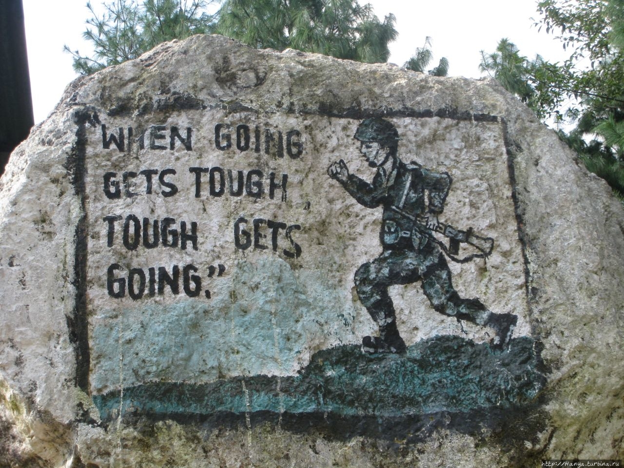 Дорога забирала вверх, и действительно, открывала панорамные виды долины с ее овощными и рисовыми террасами и торчащими там-сям отелями на холмах. Не встретив никого по дороге, наконец, добираемся до входа в воинскую часть, возле которой устроена беседка. Обращаем внимание, что для уставших путников здесь есть вода. Садимся в укрытие передохнуть и попить водички, любопытный часовой от безделья вступает с нами в диалог, расспрашивая, как нас зовут и откуда мы.
