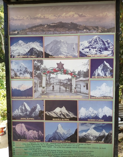 Приглядевшись к красочному плакату в отеле, мы поняли, что в Нагаркоте доминирует диапазон хребта Langtang, который виден отлично в хорошие дни. Дымка обычно скрывает что-либо к западу от горы Ganesh Himal, хотя иногда можно увидеть Himchuli и даже Аннапурну. Вид на восток еще более зависит от погоды, и гора Khumbu редко появляется в дымке розового рассвета. А вот Эверест можно увидеть в хороший день, но только с высоты, возле смотровой башни: это второй пик слева от округлой м-образной горы.