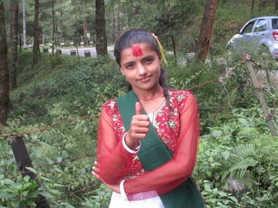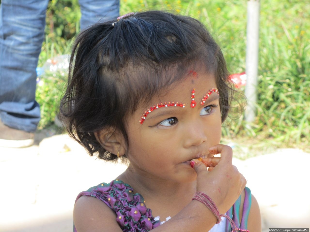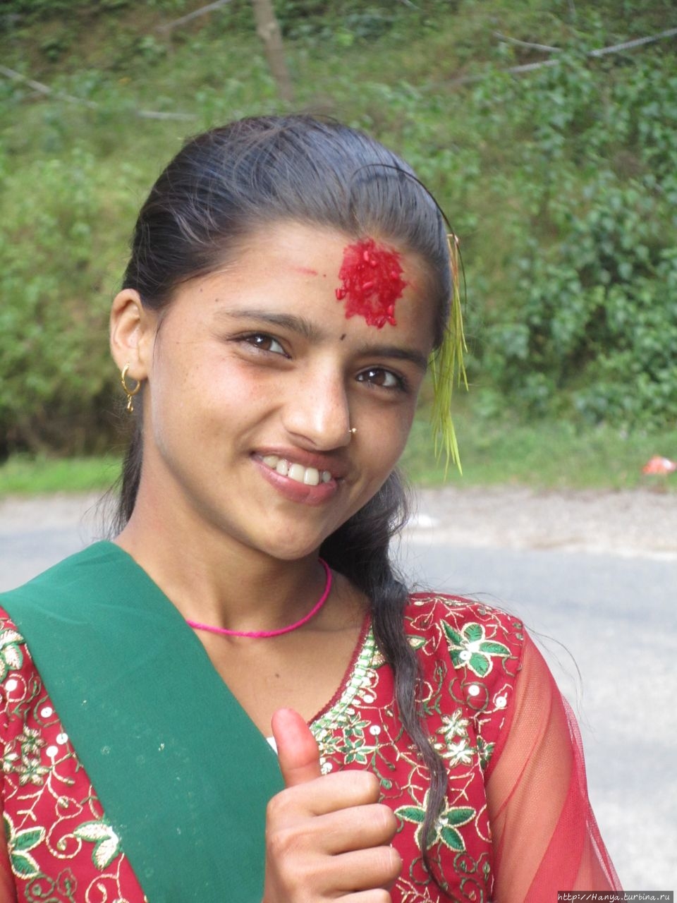 К полудню паломничество наверх усиливается, люди идут пешком и едут на такси. Встречаем троих молодых непальцев, среди которых очень красивая девушка в красочном наряде и с яркой праздничной тикой на лбу.