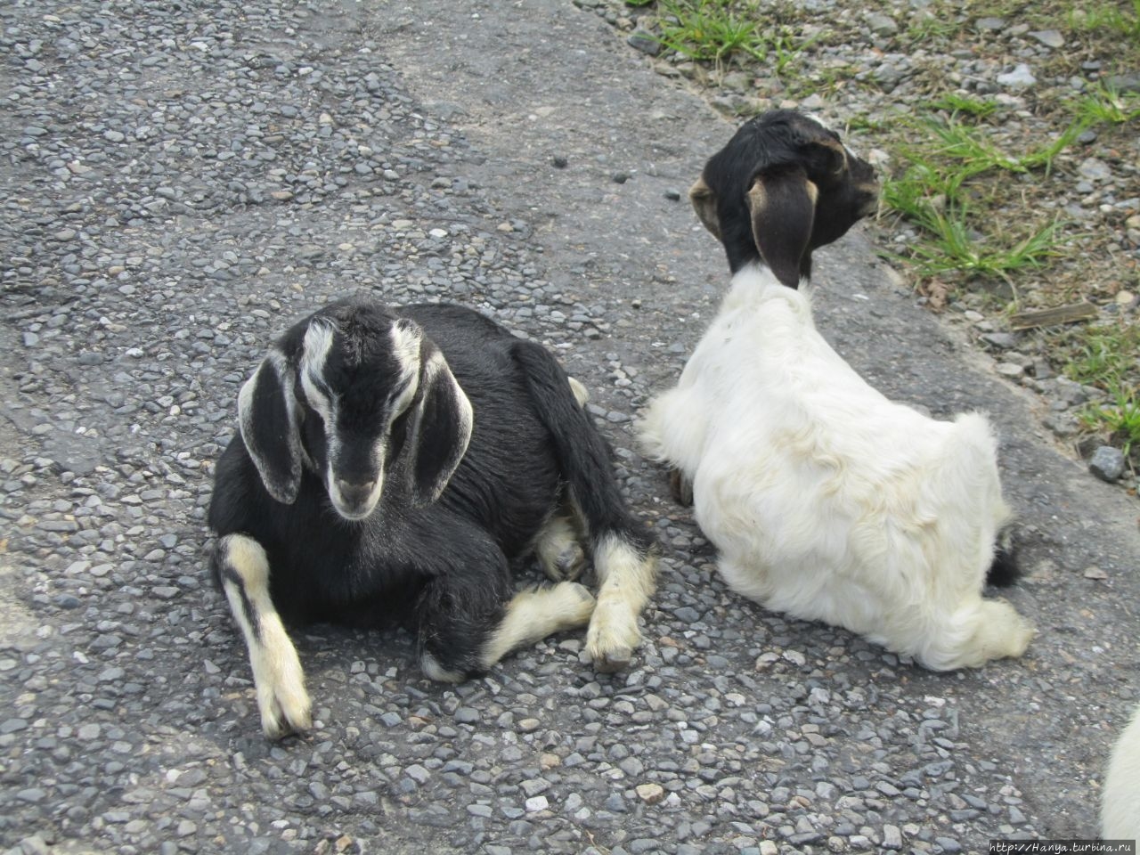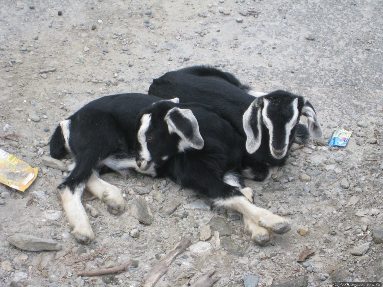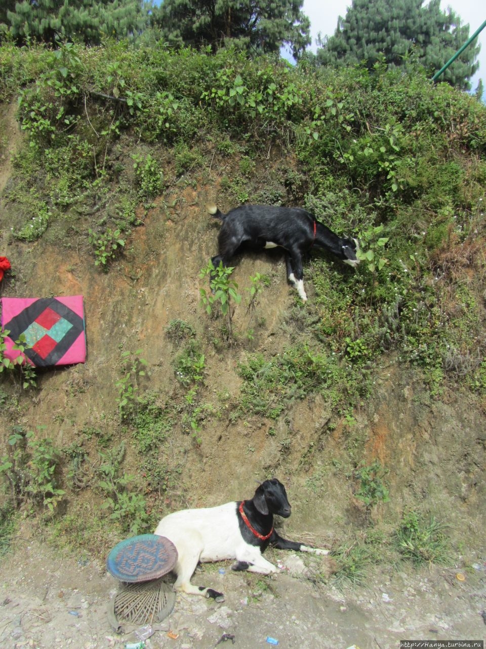 Мы выбрали лучшее время для посещения Непала, так как позднее здесь может быть и холодно и ветрено, но неужели нам все-таки не повезет с обещанной видимостью в горах? Снова останавливаемся в беседке у воинской части, и даже немного подремали в ней, улегшись на лавках. Разбудил нас громкий говор очередных туристов, идущих наверх. Они оказались русскими израильтянами, и мы пообсуждали с ними новости двух стран. Пожелав друг другу доброго пути, вновь отправляемся в путь. По дороге вниз садимся на видовой площадке, рядом пасутся смешные козочки.