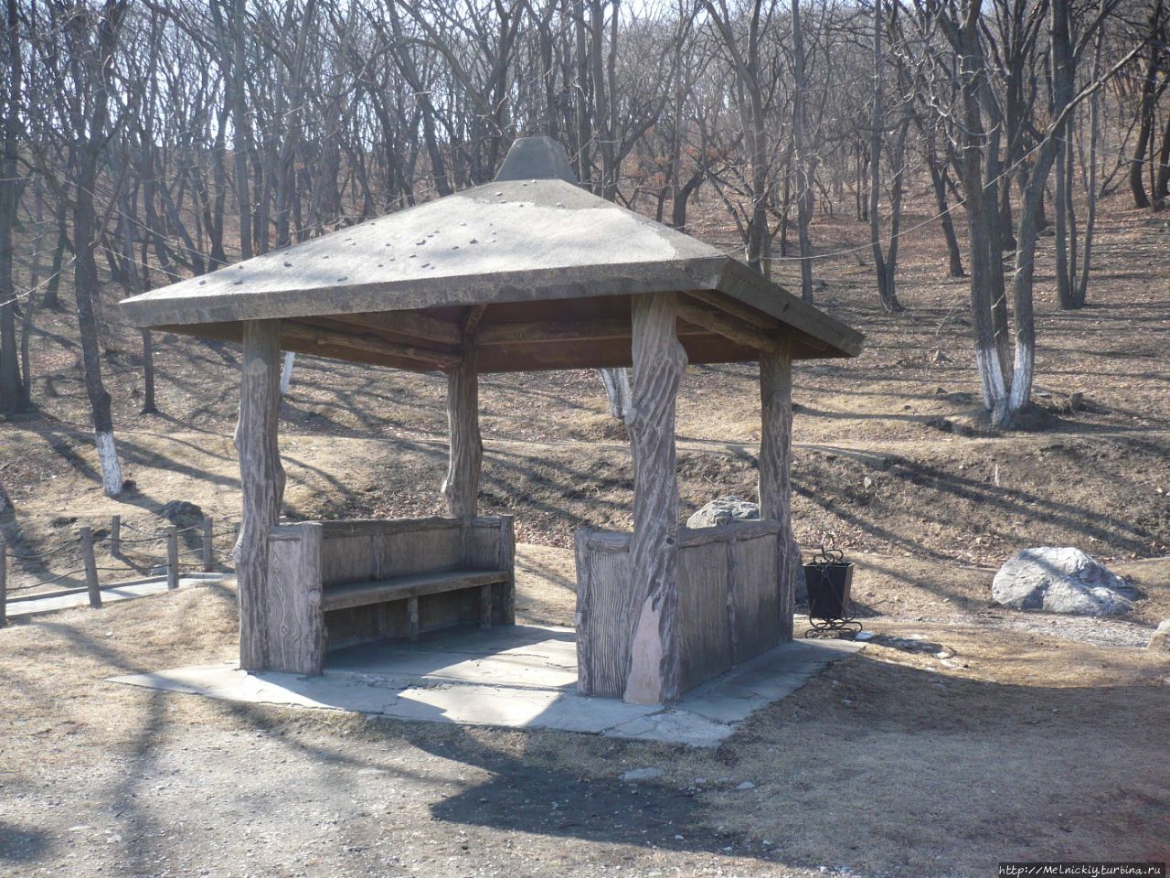 Недалеко от входа в сад установлена крытая беседка, скамьи и стол. Они изготовлены из бетона, но издалека, кажутся деревянными.