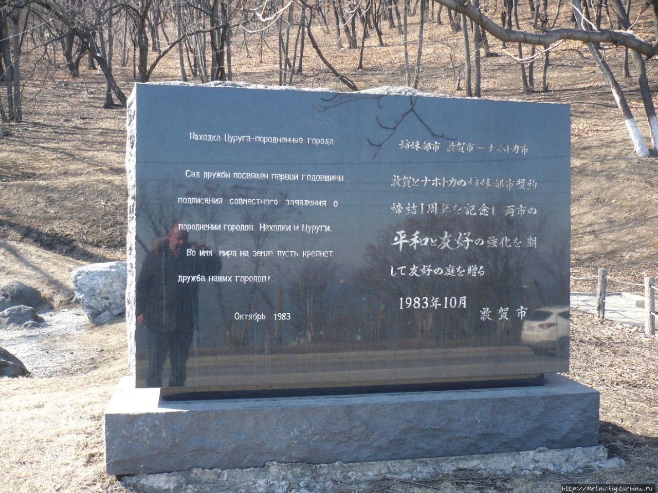 Возле сада установлена черная полированная плита с надписями на японском и русском языке: «Находка-Цуруга – породненные города. Сад дружбы посвящен первой годовщине» подписания совместного заявления о породнении городов Находки и Цуруги. Во имя мира на земле пусть крепнет дружба наших городов. Октябрь, 1983». Автором памятника выступил мэр Туруги – Такаги Капчи, дизайнеры Китамура и Хиробояси.