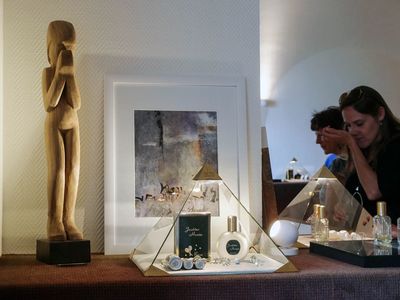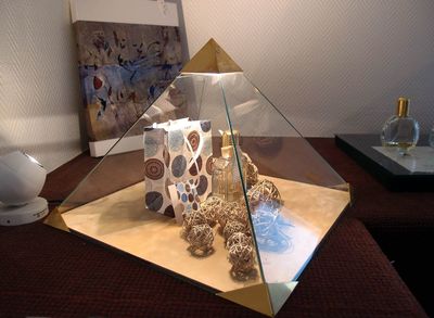 Вот только ни на одном сайте мне не попалось информации о времени начала экскурсии, а как оказалось, она проводится один раз в день, в 15:30. Собственно, сами мы ни о какой экскурсии и не вспомнили, стоило лишь оказаться в демонстрационном зале "Ги Дельфорж" (Guy Delforge). Нам и так сразу снесло крышу нашлось занятие в этом маленьком царстве чудесных запахов, среди искусно подсвеченных стеклянных пирамид и хрустальных флаконов для духов.