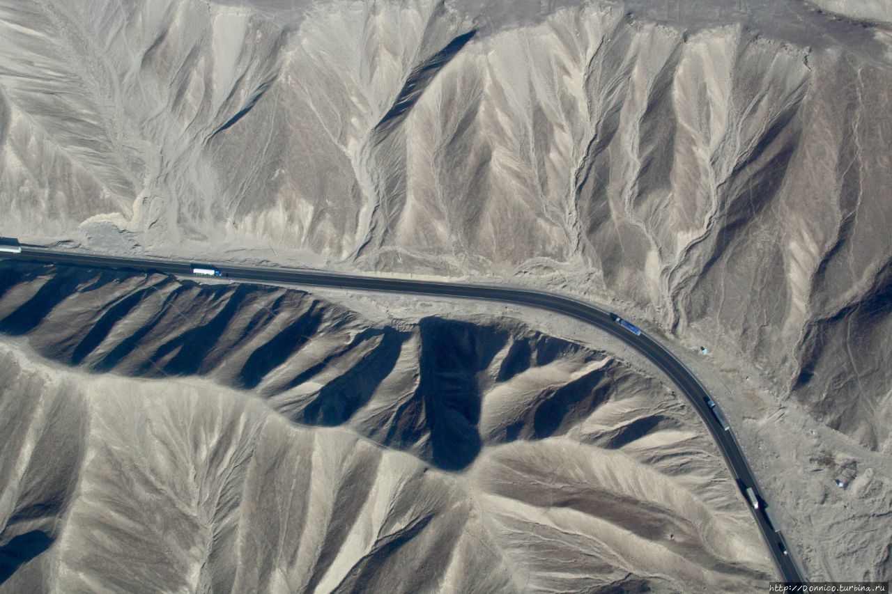 Летим дальше, пролетая над прорытом в горах последним рукавом дороги, которая после выхода на свет, выводит путников трансамериканского шоссе на плато Наски.