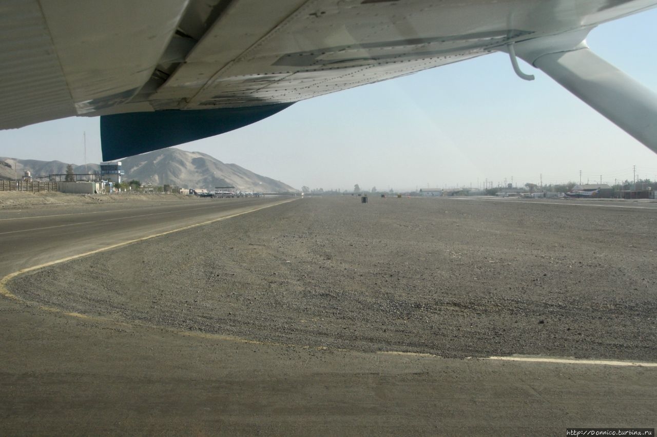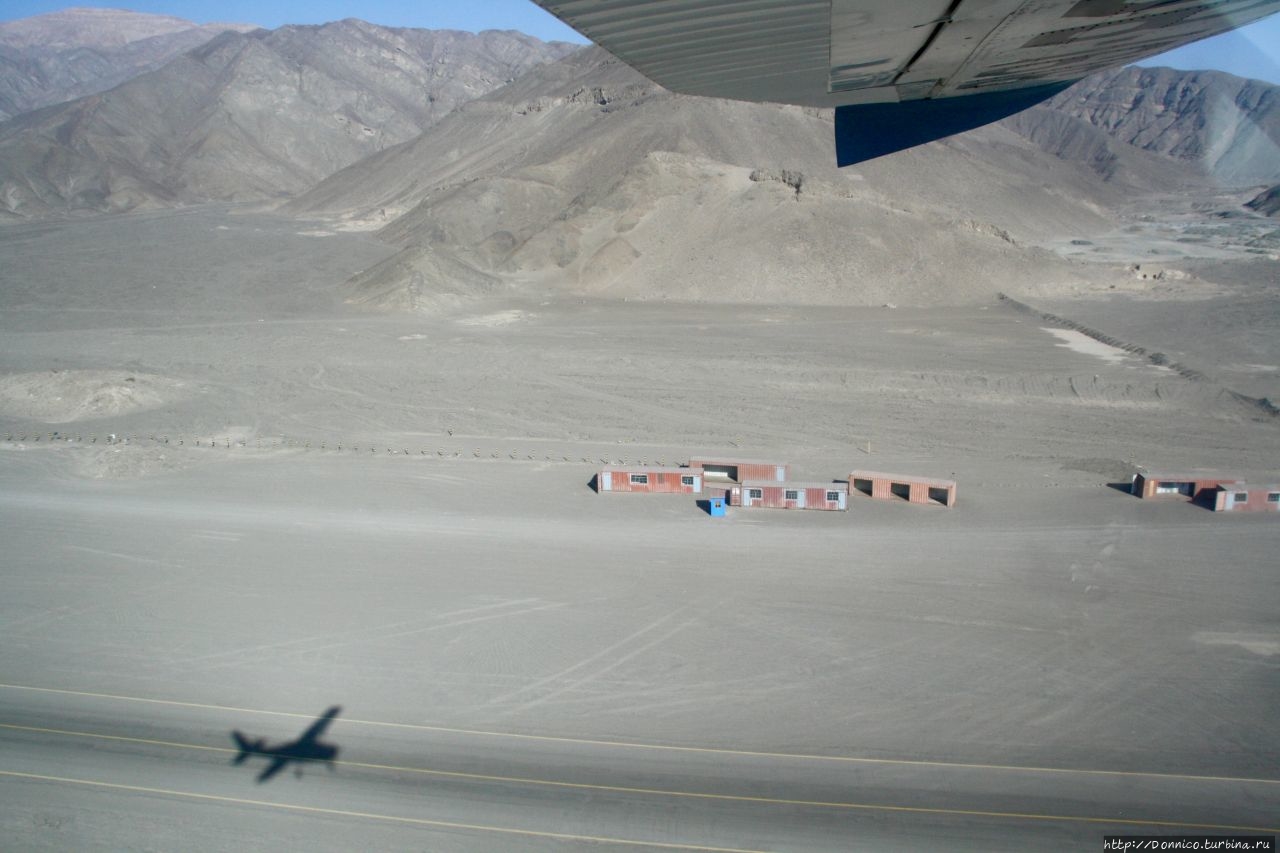 Пустынные здания аэропорта Наски остаются крошечными объектами далеко на земле, по которой прямо по только что покинутой нами взлетно-посадочной полосе неуловимо быстро мчится наша тень.