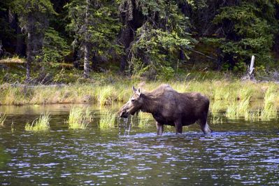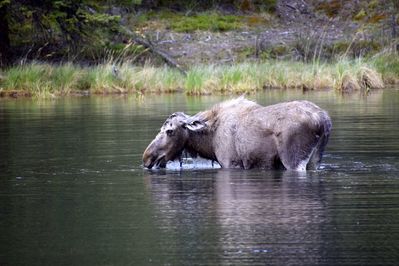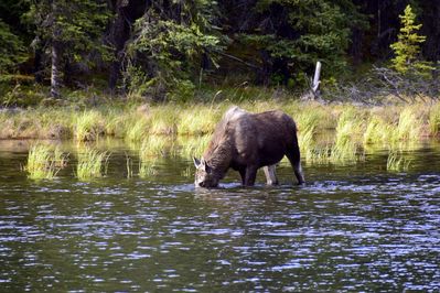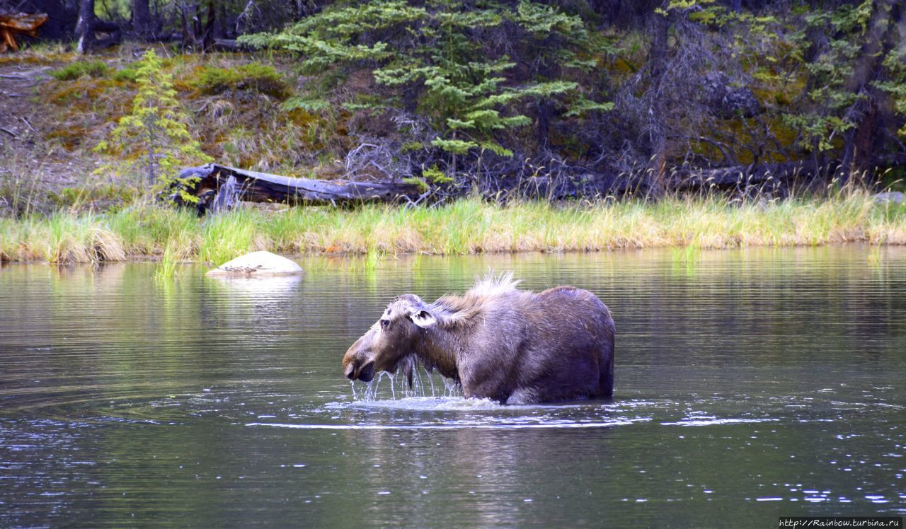 Хотя похоже, то не только за этим. Лось — травоядное животное, которое можно назвать гурманом. Он питается, как и олень, травой, ветками и листьями деревьев и кустов. Но, в отличии от оленей, он еще питается водорослями из озер. Похоже, что этот лось именно за этим сюда и пришел.