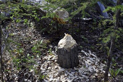 А, точно, вот и первые следы. Так грызет деревья только бобер. Он их буквально отгрызает и потом строит запруду и свой домик.