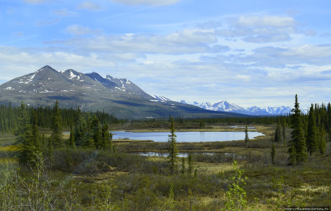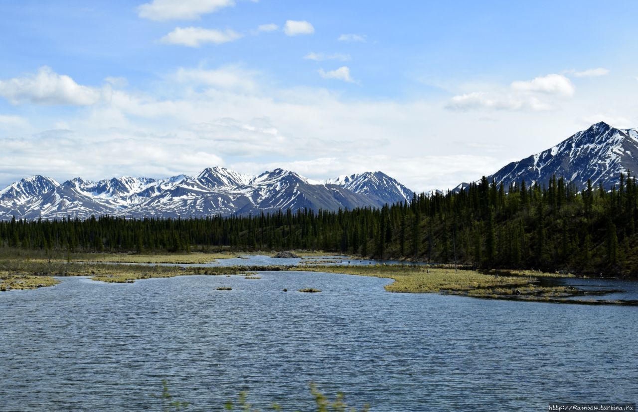 Появляются реки, они вливаются в озера, все вместе на фоне горного хребта выглядит очень живописно. Видно, что горы в парке Денали намного выше своих южных собратьев, которые мы видели в прошедшие дни, потому что все покрыты снегом, без каких-либо зеленых лесных прогалин.