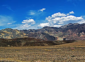Долина Смерти. Badwater basin - пешком на глубине 86 метров по дороге 178 с юга на север постепенно растительность пропадает вовсе, слева бесконечное покрытое солью почти белое дно, являющееся собственно Долиной Смерти. Когда глаз потихоньку привыкает к такой картинке, на арену выходят гряды раскашеных всеми цветами радуги не высоких гор.