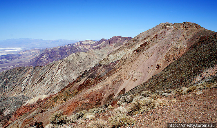 Прямо за аппаратом было ответвление от 190 дороги с указателем Данте Вью. Проехав километров десять мы забрались на высокую гору с которой была видна вся Долина смерти. Картина полностью соответствовала названию и была очень страшная. Под нами расстилался огромный каньон с милым названием Бэд Вотер. Ни одного растения, которому могли бы помочь наши пятнадцать долларов видно не было. Кинул нас Аппарат.