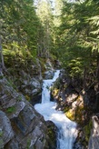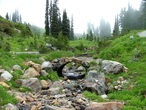 Гора Рейнир — самый высокий из вулканов Каскадного хребта, и единственный со своим собственным национальным парком. Там, где кончается автомобильная дорога, в июле во всю ещё лежит снег...