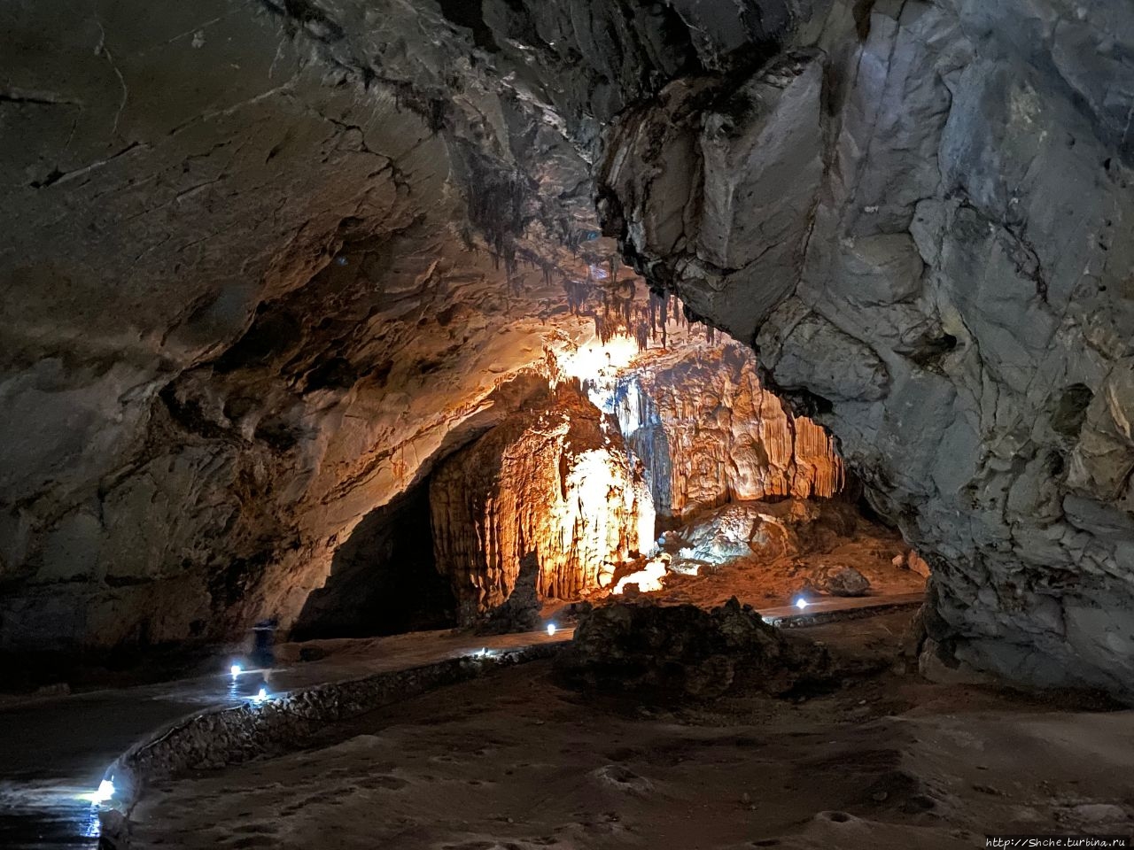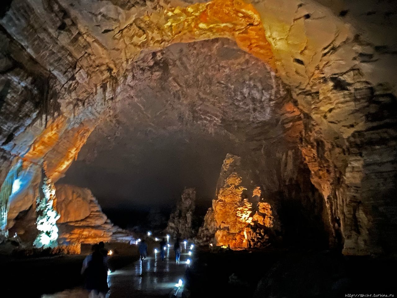 Посетители самостоятельно входят в пещеру, внутри которой обнаруживают широкую дорожку, уходящую вглубь и подсвеченную фонариками.