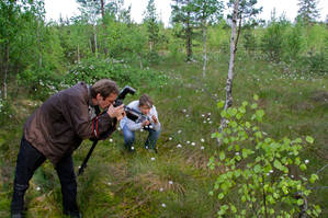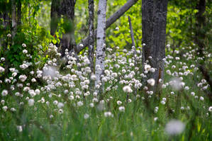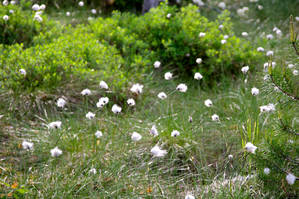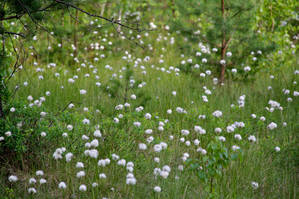 Пушица, которая также как и багульник цветет на болотах, невероятно фотогеничное растение. Сочетание белого тонкого пушка с сочной зеленью болот настолько притягивает, что рискуешь, поддавшись охотничьему азарту легко пригнуть не на ту кочку и по колено провалится в воду.
